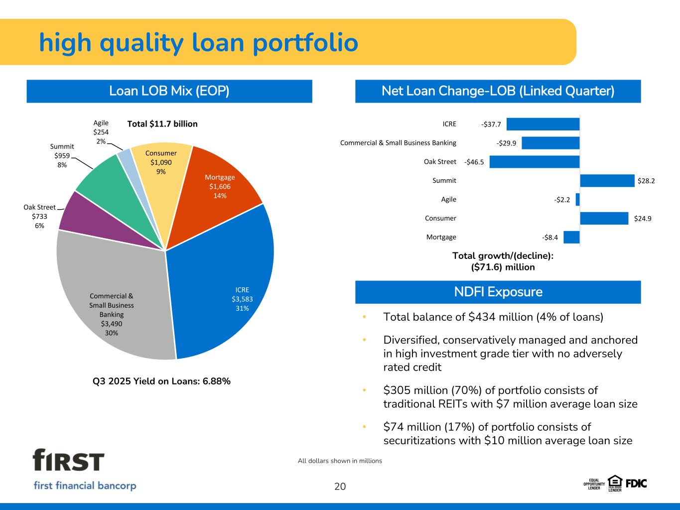 19 All dollars shown in millions attractive deposit portfolio Deposit Product Mix (Avg) 3Q25 Average Deposit Progression Total growth/(decline): $157.2 million Noninterest- bearing $3,002 21% Interest-bearing demand $1,786 12% Savings $994 7% Money Market $3,337 23% Retail CDs $1,968 13% Brokered Deposits $1,416 10% Public Funds $2,009 14% Total $14.5 billion -$11.9 $38.3 -$9.9 $106.4 $10.3 $165.8 -$141.8 Noninterest-bearing Interest-bearing demand Savings Money Market Retail CDs Brokered Deposits Public Funds Q3 2025 Cost of Total Deposits: 2.13% Uninsured Deposits Uninsured deposits (per call report instructions) 6,073$ Less: Public funds 1,766 Less: Intercompany deposits 556 Adjusted uninsured deposits 3,751 Borrowing capacity 5,303 Borrowing capacity in excess of adjusted uninsured deposits $ 1,552 Borrowing capacity as a % of adjusted uninsured deposits 141.4% Adjusted uninsured deposits to total deposits 26.0%
