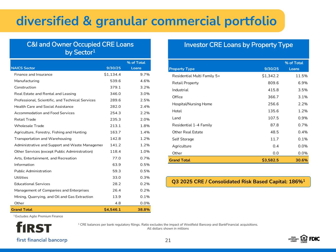 high quality loan portfolio 20 All dollars shown in millions Loan LOB Mix (EOP) Net Loan Change-LOB (Linked Quarter) Total growth/(decline): ($71.6) million ICRE $3,583 31% Commercial & Small Business Banking $3,490 30% Oak Street $733 6% Summit $959 8% Agile $254 2% Consumer $1,090 9% Mortgage $1,606 14% Total $11.7 billion -$37.7 -$29.9 -$46.5 $28.2 -$2.2 $24.9 -$8.4 ICRE Commercial & Small Business Banking Oak Street Summit Agile Consumer Mortgage Q3 2025 Yield on Loans: 6.88% NDFI Exposure • Total balance of $434 million (4% of loans) • Diversified, conservatively managed and anchored in high investment grade tier with no adversely rated credit • $305 million (70%) of portfolio consists of traditional REITs with $7 million average loan size • $74 million (17%) of portfolio consists of securitizations with $10 million average loan size