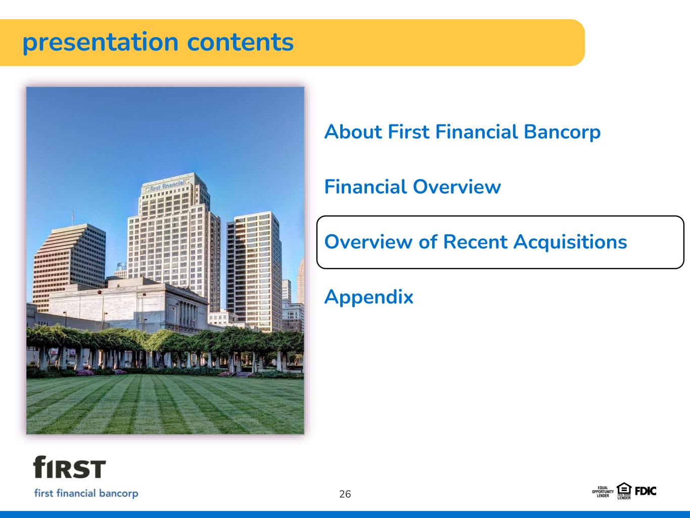 About First Financial Bancorp Financial Overview Overview of Recent Acquisitions Appendix presentation contents 26