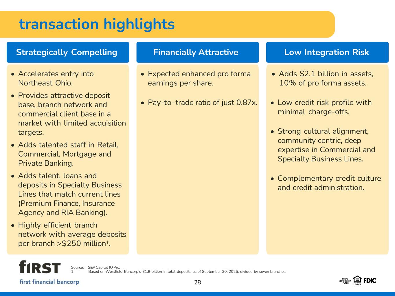 27 overview of Westfield Bancorp Westfield Bank Lines of Business • Commercial Banking / Treasury Management • Agency Banking and Premium Finance • Registered Investment Advisor Banking • Consumer - Retail • Consumer - Mortgage • Private Banking 3.23% YTD NIM $2.1B in assets Consolidated Financial Highlights as of September 30, 2025 $1.7B in loans $1.8B in deposits 11.9% TCE / TA $14.5MM YTD Net Income Headquarters: Westfield Center, OH Branches: 7 Active (1 Pending) Employees: 1801 • Westfield Bancorp, the holding company for Westfield Bank, FSB (“Westfield Bank”), is 100% owned by Ohio Farmers Insurance Company (“OFIC”) (d/b/a Westfield), a mutual insurance company founded in 1848. • Westfield is a global leader in property and casualty insurance and underwrites commercial, personal surety, and specialty lines of coverage through its network of leading independent agents and brokers across the united States. Source: S&P Capital IQ Pro and Westfield Bancorp documents. Data as of or for the period ended 9/30/25. 1 Represents full-time employees at Westfield Bank, FSB.