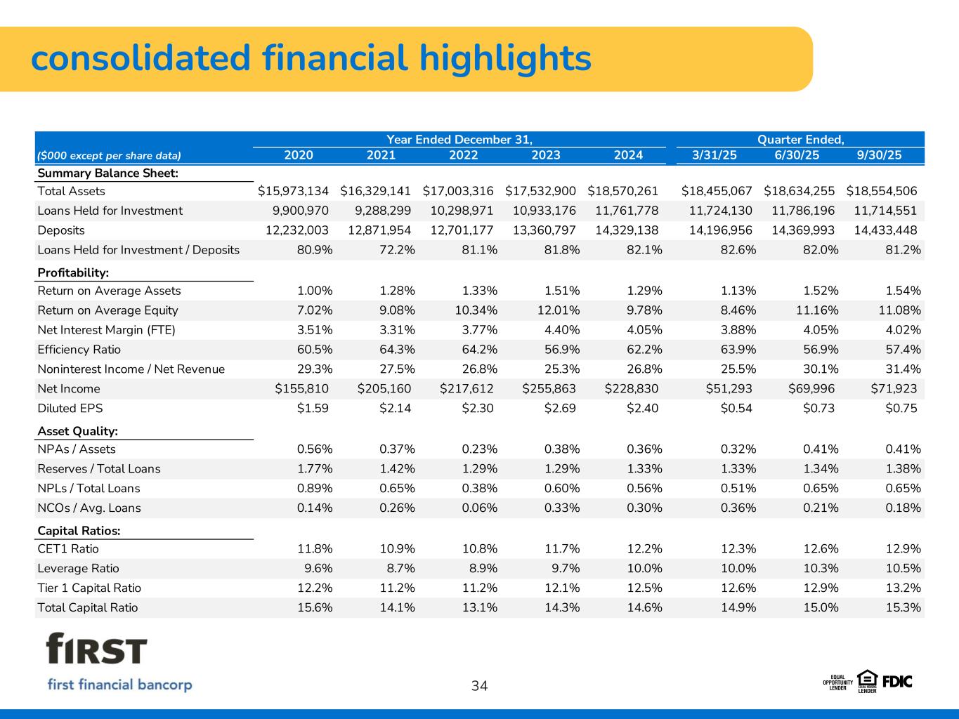 consolidated financial highlights 34 Year Ended December 31, Quarter Ended, ($000 except per share data) 2020 2021 2022 2023 2024 3/31/25 6/30/25 9/30/252021 Summary Balance Sheet: Total Assets $15,973,134 $16,329,141 $17,003,316 $17,532,900 $18,570,261 $18,455,067 $18,634,255 $18,554,506 Loans Held for Investment 9,900,970 9,288,299 10,298,971 10,933,176 11,761,778 11,724,130 11,786,196 11,714,551 Deposits 12,232,003 12,871,954 12,701,177 13,360,797 14,329,138 14,196,956 14,369,993 14,433,448 Loans Held for Investment / Deposits 80.9% 72.2% 81.1% 81.8% 82.1% 82.6% 82.0% 81.2% Profitability: Return on Average Assets 1.00% 1.28% 1.33% 1.51% 1.29% 1.13% 1.52% 1.54% Return on Average Equity 7.02% 9.08% 10.34% 12.01% 9.78% 8.46% 11.16% 11.08% Net Interest Margin (FTE) 3.51% 3.31% 3.77% 4.40% 4.05% 3.88% 4.05% 4.02% Efficiency Ratio 60.5% 64.3% 64.2% 56.9% 62.2% 63.9% 56.9% 57.4% Noninterest Income / Net Revenue 29.3% 27.5% 26.8% 25.3% 26.8% 25.5% 30.1% 31.4% Net Income $155,810 $205,160 $217,612 $255,863 $228,830 $51,293 $69,996 $71,923 Diluted EPS $1.59 $2.14 $2.30 $2.69 $2.40 $0.54 $0.73 $0.75 Asset Quality: NPAs / Assets 0.56% 0.37% 0.23% 0.38% 0.36% 0.32% 0.41% 0.41% Reserves / Total Loans 1.77% 1.42% 1.29% 1.29% 1.33% 1.33% 1.34% 1.38% NPLs / Total Loans 0.89% 0.65% 0.38% 0.60% 0.56% 0.51% 0.65% 0.65% NCOs / Avg. Loans 0.14% 0.26% 0.06% 0.33% 0.30% 0.36% 0.21% 0.18% Capital Ratios: CET1 Ratio 11.8% 10.9% 10.8% 11.7% 12.2% 12.3% 12.6% 12.9% Leverage Ratio 9.6% 8.7% 8.9% 9.7% 10.0% 10.0% 10.3% 10.5% Tier 1 Capital Ratio 12.2% 11.2% 11.2% 12.1% 12.5% 12.6% 12.9% 13.2% Total Capital Ratio 15.6% 14.1% 13.1% 14.3% 14.6% 14.9% 15.0% 15.3%