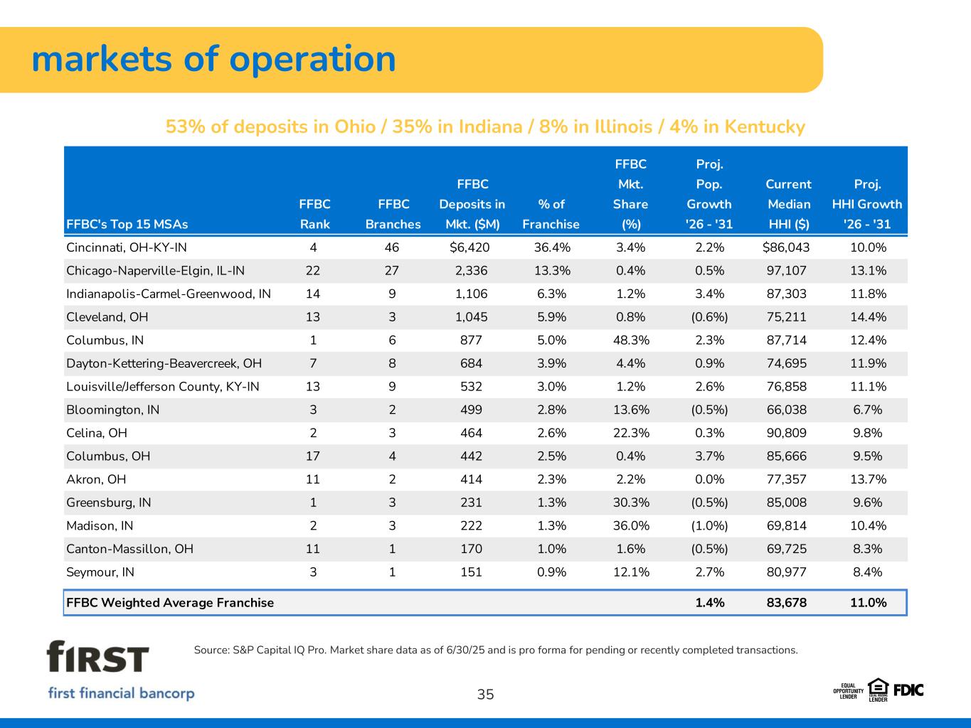 markets of operation 35 Source: S&P Capital IQ Pro. Market share data as of 6/30/25 and is pro forma for pending or recently completed transactions. FFBC's Top 15 MSAs FFBC Rank FFBC Branches FFBC Deposits in Mkt. ($M) % of Franchise FFBC Mkt. Share (%) Proj. Pop. Growth '26 - '31 Current Median HHI ($) Proj. HHI Growth '26 - '31 Cincinnati, OH-KY-IN 4 46 $6,420 36.4% 3.4% 2.2% $86,043 10.0% Chicago-Naperville-Elgin, IL-IN 22 27 2,336 13.3% 0.4% 0.5% 97,107 13.1% Indianapolis-Carmel-Greenwood, IN 14 9 1,106 6.3% 1.2% 3.4% 87,303 11.8% Cleveland, OH 13 3 1,045 5.9% 0.8% (0.6%) 75,211 14.4% Columbus, IN 1 6 877 5.0% 48.3% 2.3% 87,714 12.4% Dayton-Kettering-Beavercreek, OH 7 8 684 3.9% 4.4% 0.9% 74,695 11.9% Louisville/Jefferson County, KY-IN 13 9 532 3.0% 1.2% 2.6% 76,858 11.1% Bloomington, IN 3 2 499 2.8% 13.6% (0.5%) 66,038 6.7% Celina, OH 2 3 464 2.6% 22.3% 0.3% 90,809 9.8% Columbus, OH 17 4 442 2.5% 0.4% 3.7% 85,666 9.5% Akron, OH 11 2 414 2.3% 2.2% 0.0% 77,357 13.7% Greensburg, IN 1 3 231 1.3% 30.3% (0.5%) 85,008 9.6% Madison, IN 2 3 222 1.3% 36.0% (1.0%) 69,814 10.4% Canton-Massillon, OH 11 1 170 1.0% 1.6% (0.5%) 69,725 8.3% Seymour, IN 3 1 151 0.9% 12.1% 2.7% 80,977 8.4% FFBC Weighted Average Franchise 1.4% 83,678 11.0% 53% of deposits in Ohio / 35% in Indiana / 8% in Illinois / 4% in Kentucky