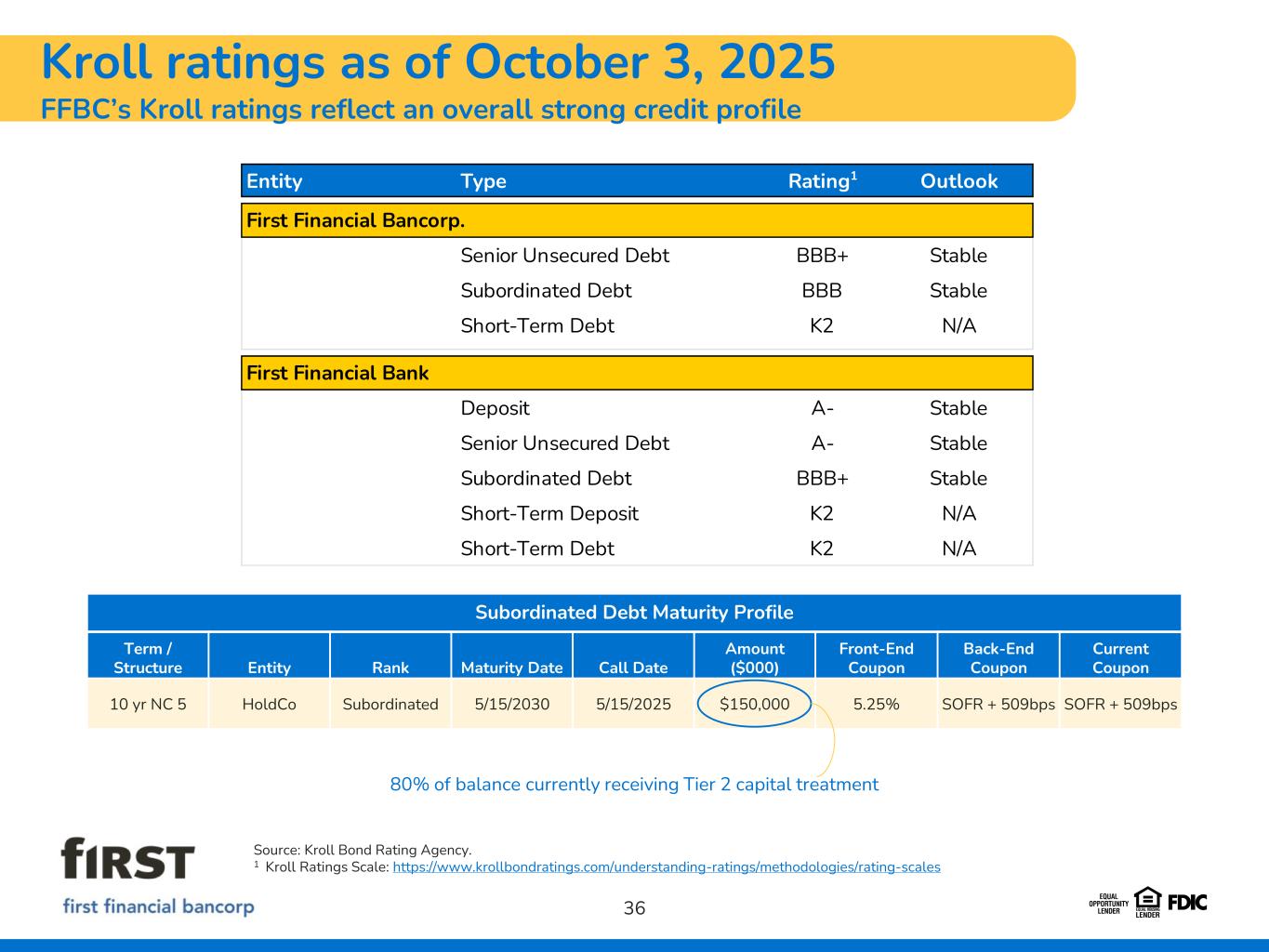 Kroll ratings as of October 3, 2025 FFBC’s Kroll ratings reflect an overall strong credit profile 36 Source: Kroll Bond Rating Agency. 1 Kroll Ratings Scale: https://www.krollbondratings.com/understanding-ratings/methodologies/rating-scales Entity Type Rating1 Outlook First Financial Bancorp. Senior Unsecured Debt BBB+ Stable Subordinated Debt BBB Stable Short-Term Debt K2 N/A First Financial Bank Deposit A- Stable Senior Unsecured Debt A- Stable Subordinated Debt BBB+ Stable Short-Term Deposit K2 N/A Short-Term Debt K2 N/A Subordinated Debt Maturity Profile Term / Structure Entity Rank Maturity Date Call Date Amount ($000) Front-End Coupon Back-End Coupon Current Coupon 10 yr NC 5 HoldCo Subordinated 5/15/2030 5/15/2025 $150,000 5.25% SOFR + 509bps SOFR + 509bps 80% of balance currently receiving Tier 2 capital treatment