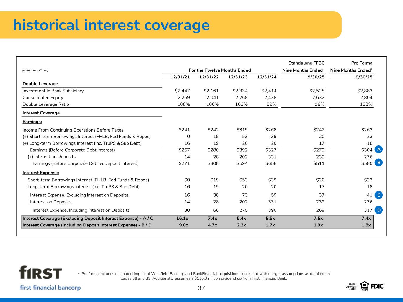 historical interest coverage 37 Standalone FFBC Pro Forma (dollars in millions) For the Twelve Months Ended Nine Months Ended Nine Months Ended1 12/31/21 12/31/22 12/31/23 12/31/24 9/30/25 9/30/25 Double Leverage Investment in Bank Subsidiary $2,447 $2,161 $2,334 $2,414 $2,528 $2,883 Consolidated Equity 2,259 2,041 2,268 2,438 2,632 2,804 Double Leverage Ratio 108% 106% 103% 99% 96% 103% Interest Coverage Earnings: Income From Continuing Operations Before Taxes $241 $242 $319 $268 $242 $263 (+) Short-term Borrowings Interest (FHLB, Fed Funds & Repos) 0 19 53 39 20 23 (+) Long-term Borrowings Interest (inc. TruPS & Sub Debt) 16 19 20 20 17 18 Earnings (Before Corporate Debt Interest) $257 $280 $392 $327 $279 $304 (+) Interest on Deposits 14 28 202 331 232 276 Earnings (Before Corporate Debt & Deposit Interest) $271 $308 $594 $658 $511 $580 Interest Expense: Short-term Borrowings Interest (FHLB, Fed Funds & Repos) $0 $19 $53 $39 $20 $23 Long-term Borrowings Interest (inc. TruPS & Sub Debt) 16 19 20 20 17 18 Interest Expense, Excluding Interest on Deposits 16 38 73 59 37 41 Interest on Deposits 14 28 202 331 232 276 Interest Expense, Including Interest on Deposits 30 66 275 390 269 317 Interest Coverage (Excluding Deposit Interest Expense) - A / C 16.1x 7.4x 5.4x 5.5x 7.5x 7.4x Interest Coverage (Including Deposit Interest Expense) - B / D 9.0x 4.7x 2.2x 1.7x 1.9x 1.8x A B C D 1 Pro forma includes estimated impact of Westfield Bancorp and BankFinancial acquisitions consistent with merger assumptions as detailed on pages 38 and 39. Additionally assumes a $110.0 million dividend up from First Financial Bank.