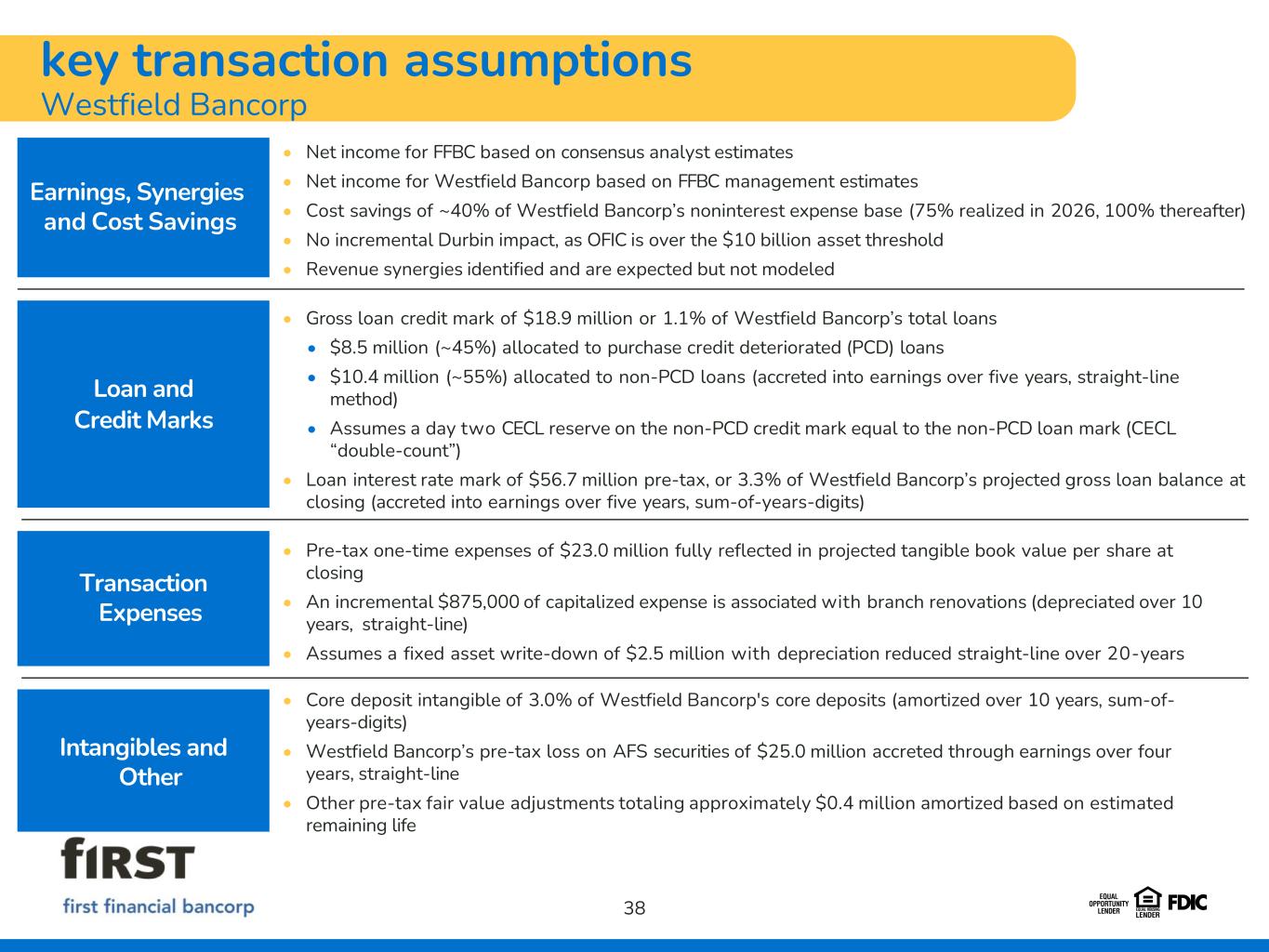 key transaction assumptions Westfield Bancorp 38 Earnings, Synergies and Cost Savings • Net income for FFBC based on consensus analyst estimates • Net income for Westfield Bancorp based on FFBC management estimates • Cost savings of ~40% of Westfield Bancorp’s noninterest expense base (75% realized in 2026, 100% thereafter) • No incremental Durbin impact, as OFIC is over the $10 billion asset threshold • Revenue synergies identified and are expected but not modeled • Gross loan credit mark of $18.9 million or 1.1% of Westfield Bancorp’s total loans • $8.5 million (~45%) allocated to purchase credit deteriorated (PCD) loans • $10.4 million (~55%) allocated to non-PCD loans (accreted into earnings over five years, straight-line method) • Assumes a day two CECL reserve on the non-PCD credit mark equal to the non-PCD loan mark (CECL “double-count”) • Loan interest rate mark of $56.7 million pre-tax, or 3.3% of Westfield Bancorp’s projected gross loan balance at closing (accreted into earnings over five years, sum-of-years-digits) • Pre-tax one-time expenses of $23.0 million fully reflected in projected tangible book value per share at closing • An incremental $875,000 of capitalized expense is associated with branch renovations (depreciated over 10 years, straight-line) • Assumes a fixed asset write-down of $2.5 million with depreciation reduced straight-line over 20-years • Core deposit intangible of 3.0% of Westfield Bancorp's core deposits (amortized over 10 years, sum-of- years-digits) • Westfield Bancorp’s pre-tax loss on AFS securities of $25.0 million accreted through earnings over four years, straight-line • Other pre-tax fair value adjustments totaling approximately $0.4 million amortized based on estimated remaining life Loan and Credit Marks Transaction Expenses Intangibles and Other