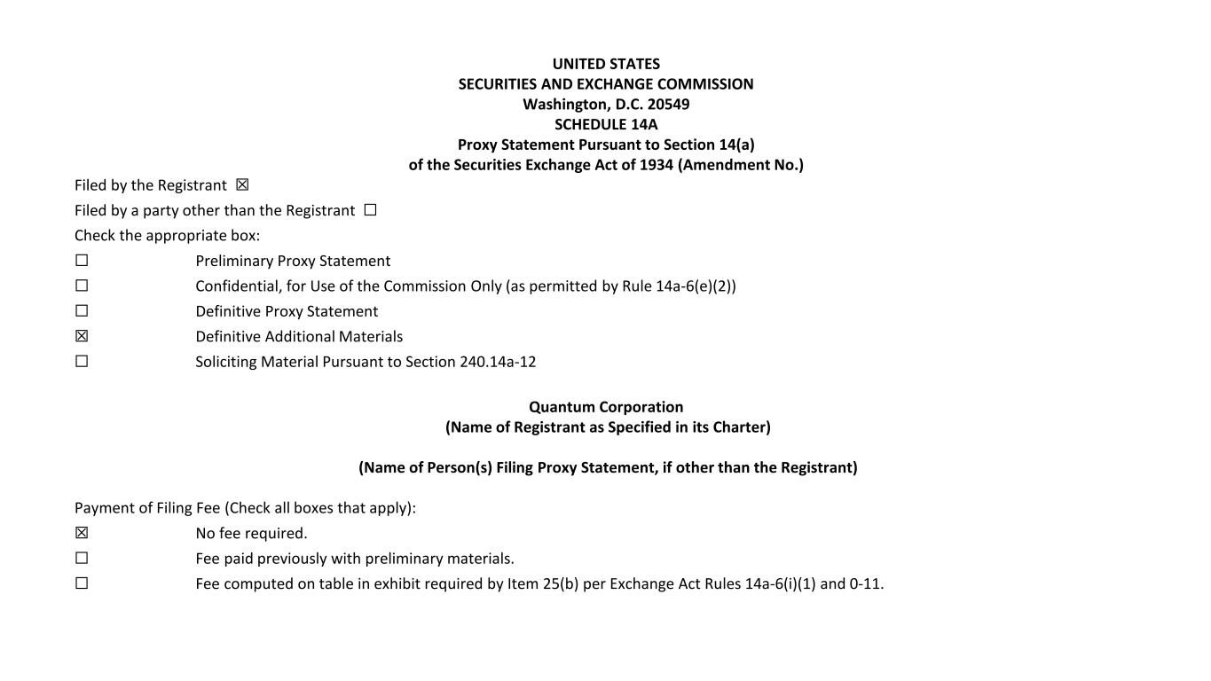 | 1© 2024 Quantum Corporation  UNITED STATES SECURITIES AND EXCHANGE COMMISSION  Washington, D.C. 20549  SCHEDULE 14A  Proxy Statement Pursuant to Section 14(a)  of the Securities Exchange Act of 1934 (Amendment No.)  Filed by the Registrant  ☒                             Filed by a party other than the Registrant  ☐  Check the appropriate box:  ☐ Preliminary Proxy Statement  ☐ Confidential, for Use of the Commission Only (as permitted by Rule 14a-6(e)(2))  ☐ Definitive Proxy Statement  ☒ Definitive Additional Materials  ☐ Soliciting Material Pursuant to Section 240.14a-12  Quantum Corporation  (Name of Registrant as Specified in its Charter)     (Name of Person(s) Filing Proxy Statement, if other than the Registrant)  Payment of Filing Fee (Check all boxes that apply):  ☒ No fee required.  ☐ Fee paid previously with preliminary materials.  ☐ Fee computed on table in exhibit required by Item 25(b) per Exchange Act Rules 14a-6(i)(1) and 0-11.