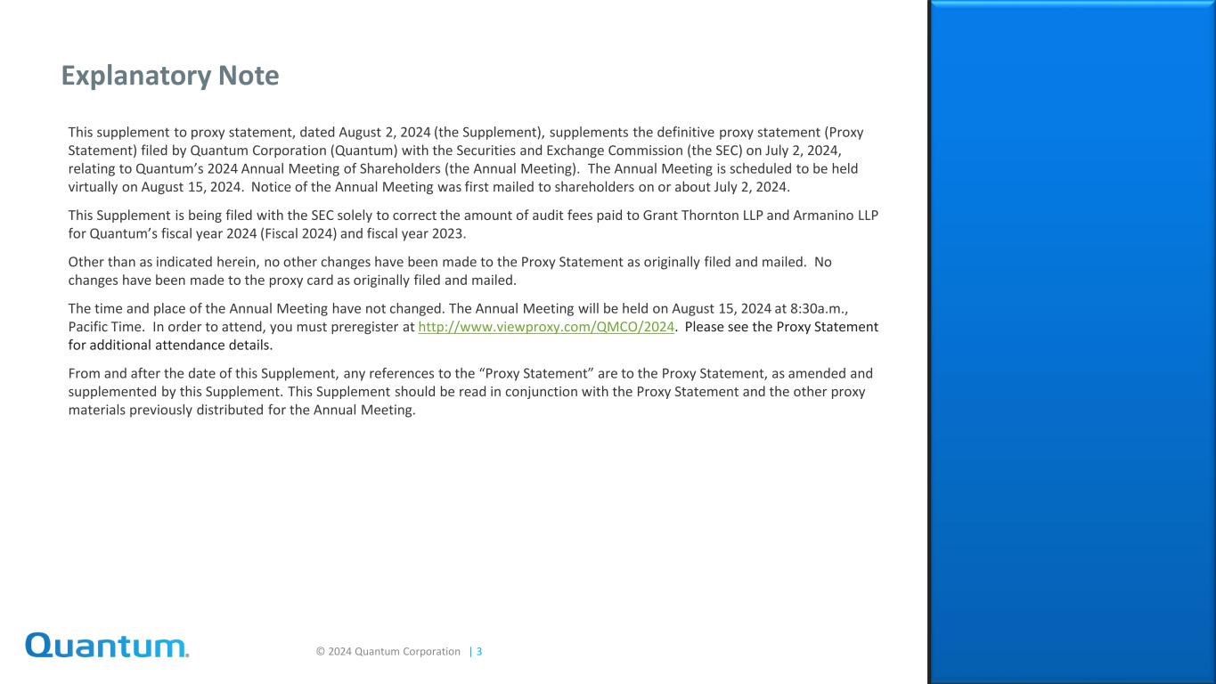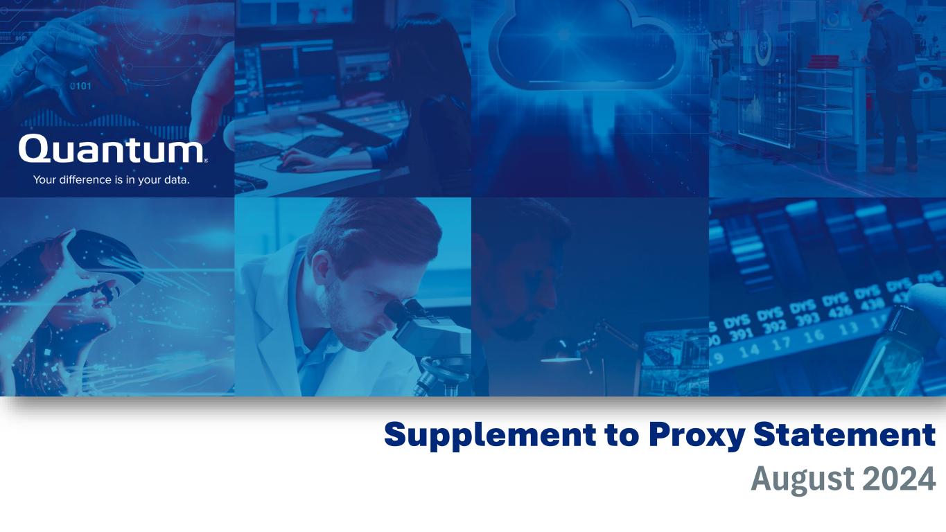 | 3© 2024 Quantum Corporation  Explanatory Note This supplement to proxy statement, dated August 2, 2024 (the Supplement), supplements the definitive proxy statement (Proxy  Statement) filed by Quantum Corporation (Quantum) with the Securities and Exchange Commission (the SEC) on July 2, 2024,  relating to Quantum’s 2024 Annual Meeting of Shareholders (the Annual Meeting).  The Annual Meeting is scheduled to be held  virtually on August 15, 2024.  Notice of the Annual Meeting was first mailed to shareholders on or about July 2, 2024. This Supplement is being filed with the SEC solely to correct the amount of audit fees paid to Grant Thornton LLP and Armanino LLP  for Quantum’s fiscal year 2024 (Fiscal 2024) and fiscal year 2023. Other than as indicated herein, no other changes have been made to the Proxy Statement as originally filed and mailed.  No  changes have been made to the proxy card as originally filed and mailed. The time and place of the Annual Meeting have not changed. The Annual Meeting will be held on August 15, 2024 at 8:30a.m.,  Pacific Time.  In order to attend, you must preregister at http://www.viewproxy.com/QMCO/2024.  Please see the Proxy Statement  for additional attendance details.  From and after the date of this Supplement, any references to the “Proxy Statement” are to the Proxy Statement, as amended and  supplemented by this Supplement. This Supplement should be read in conjunction with the Proxy Statement and the other proxy  materials previously distributed for the Annual Meeting.