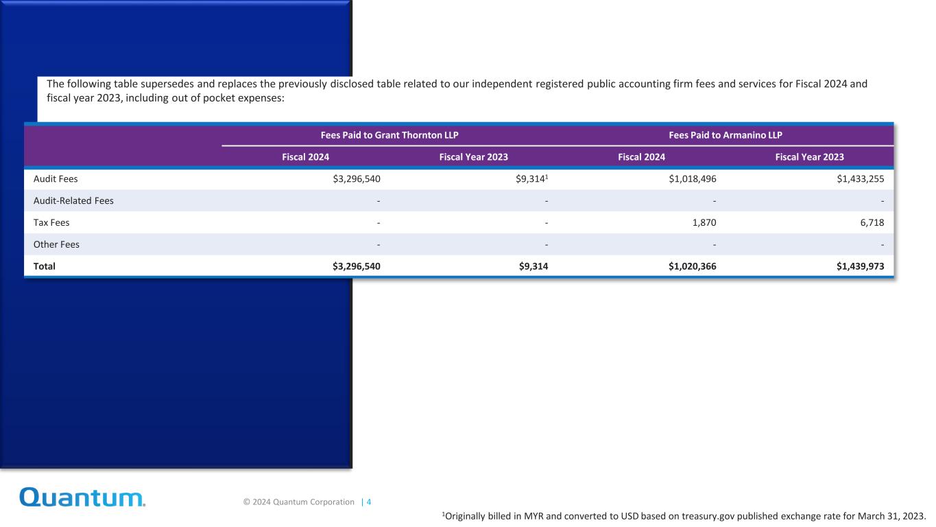 | 4© 2024 Quantum Corporation  1Originally billed in MYR and converted to USD based on treasury.gov published exchange rate for March 31, 2023.  The following table supersedes and replaces the previously disclosed table related to our independent registered public accounting firm fees and services for Fiscal 2024 and  fiscal year 2023, including out of pocket expenses: Fees Paid to Grant Thornton LLP Fees Paid to Armanino LLP Fiscal 2024 Fiscal Year 2023 Fiscal 2024 Fiscal Year 2023 Audit Fees $3,296,540 $9,3141 $1,018,496 $1,433,255 Audit-Related Fees - - - - Tax Fees - - 1,870 6,718 Other Fees - - - - Total $3,296,540 $9,314 $1,020,366 $1,439,973