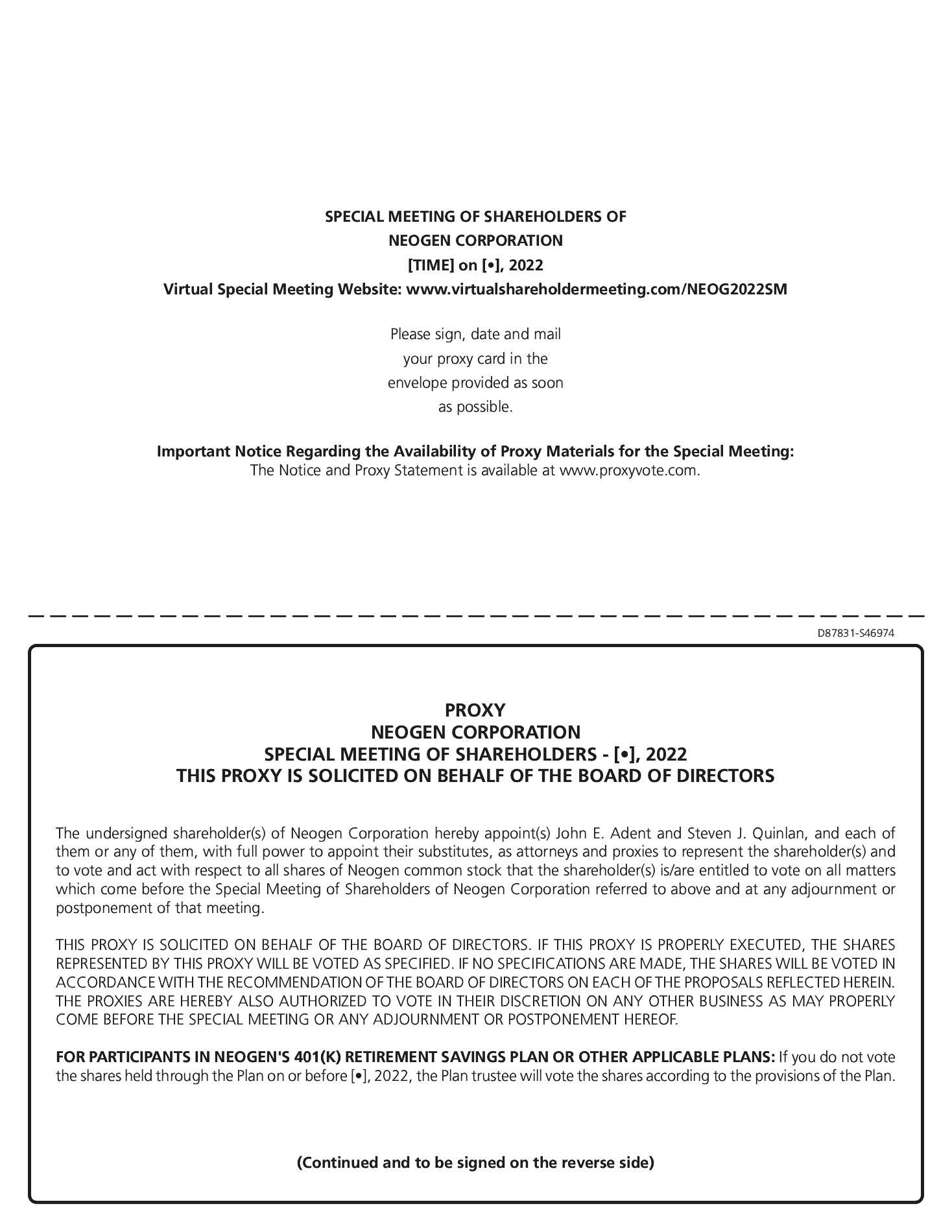 NOTICE IS HEREBY GIVEN that Neogen Corporation, a Michigan corporation, which we refer to as Neogen, will hold a special meeting of shareholders on [•] at [•] a.m., Eastern time. The special meeting will be held at Neogen’s headquarters in Lansing, Michigan, with shareholders participating in a virtual meeting format, via live webcast. You will be able to attend the special meeting online and vote your shares electronically at the meeting by visiting www.virtualshareholdermeeting.com/NEOG2022SM.