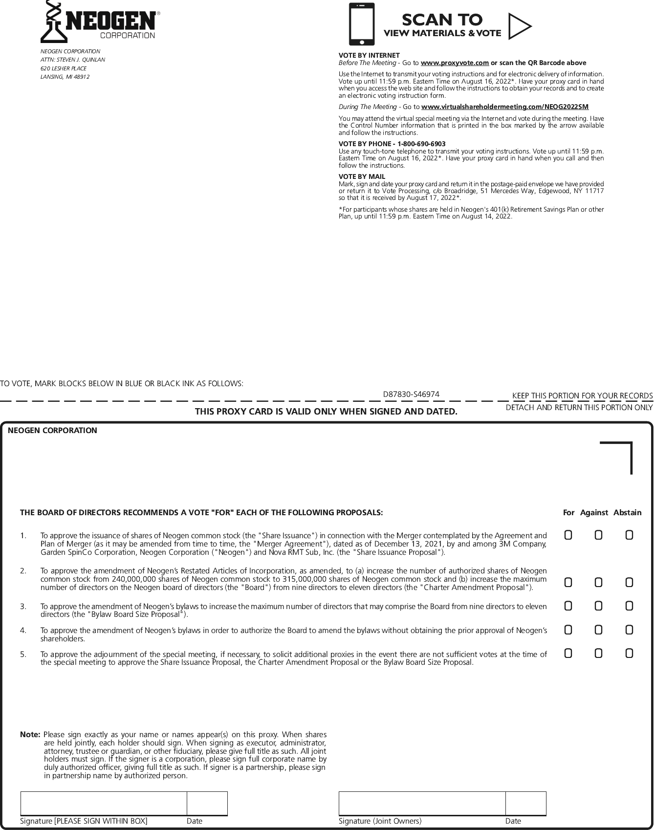 NOTICE IS HEREBY GIVEN that Neogen Corporation, a Michigan corporation, which we refer to as Neogen, will hold a special meeting of shareholders on August 17, 2022 at 9 a.m., Eastern time. The special meeting will be held at Neogen’s headquarters in Lansing, Michigan, with shareholders participating in a virtual meeting format, via live webcast. You will be able to attend the special meeting online and vote your shares electronically at the meeting by visiting www.virtualshareholdermeeting.com/NEOG2022SM.