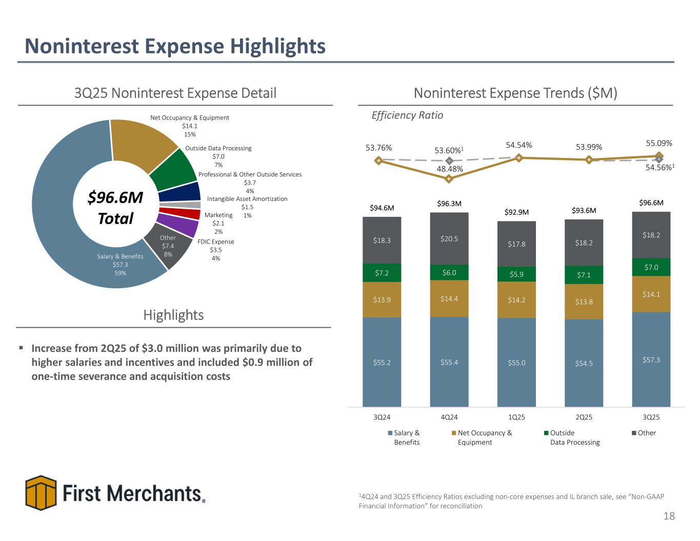 Wealth Management $8.9 27% Gain on Sale of Loans $5.0 16% Service Charges $8.9 27% Card Payment Fees $5.0 16% Derivative Hedge Fees $1.1 3%BOLI $1.7 5% Other Customer Fees $0.4 1%Other $1.5 5% Noninterest Income Highlights 17 3Q25 Noninterest Income Detail ($M) $32.5M Total Noninterest Income Trends Fee Income / Revenue Highlights Customer-related fees totaling $29.3 million for 3Q25 were stable on a linked quarter basis Customer-Related Fees ($M) 15.4% 23.4% 18.0% 18.4% 18.9% $8.5 $8.7 $8.7 $8.8 $8.9 $6.8 $5.7 $5.0 $5.9 $5.0 $8.4 $8.1 $8.1 $8.6 $8.9 $5.1 $5.0 $4.5 $4.9 $5.0 $1.0 $1.9 $0.8 $1.2 $1.5 $29.8 $29.4 $27.1 $29.4 $29.3 3Q24 4Q24 1Q25 2Q25 3Q25 Wealth Management Gain on Sale of Loans Service Charges Card Payment Fees Other Customer Fees