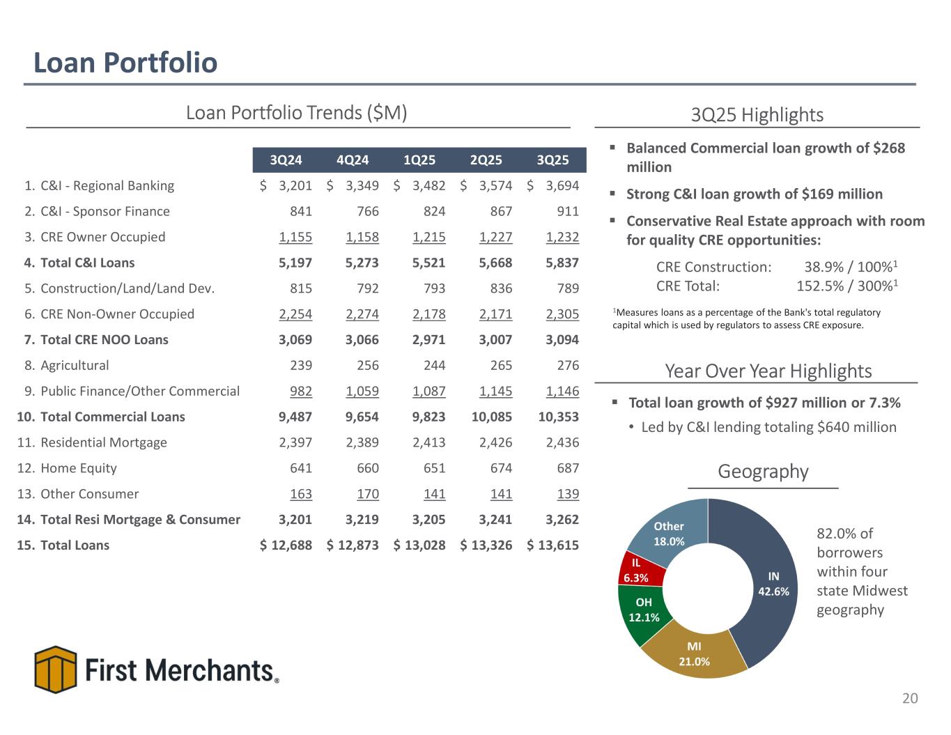 Forward Looking Statements This presentation contains forward-looking statements made pursuant to the safe-harbor provisions of the Private Securities Litigation Reform Act of 1995. Such forward-looking statements can often, but not always, be identified by the use of words like “believe”, “continue”, “pattern”, “estimate”, “project”, “intend”, “anticipate”, “expect” and similar expressions or future or conditional verbs such as “will”, “would”, “should”, “could”, “might”, “can”, “may”, or similar expressions. These forward-looking statements include, but are not limited to, statements relating to the expected timing and benefits of the proposed merger (the “Merger”) between First Merchants Corporation (“First Merchants”) and First Savings Financial Group, Inc. (“First Savings”), including future financial and operating results, cost savings, enhanced revenues, and accretion/dilution to reported earnings that may be realized from the Merger, as well as other statements of expectations regarding the Merger, and other statements of First Merchants’ goals, intentions and expectations; statements regarding the First Merchants’ business plan and growth strategies; statements regarding the asset quality of First Merchants’ loan and investment portfolios; and estimates of First Merchants’ risks and future costs and benefits whether with respect to the Merger or otherwise. These forward-looking statements are subject to significant risks, assumptions and uncertainties that may cause results to differ materially from those set forth in forward-looking statements, including, among other things: the risk that the businesses of First Merchants and First Savings will not be integrated successfully or such integration may be more difficult, time-consuming or costly than expected; expected revenue synergies and cost savings from the Merger may not be fully realized or realized within the expected time frame; revenues following the Merger may be lower than expected; customer and employee relationships and business operations may be disrupted by the Merger; the ability to obtain required regulatory approvals or the approval of First Savings’ common shareholders, and the ability to complete the Merger on the expected timeframe; possible changes in monetary and fiscal policies, and laws and regulations; the effects of easing restrictions on participants in the financial services industry; the cost and other effects of legal and administrative cases; possible changes in the credit worthiness of customers and the possible impairment of collectability of loans; fluctuations in market rates of interest; competitive factors in the banking industry; changes in the banking legislation or regulatory requirements of federal and state agencies applicable to bank holding companies and banks like First Merchants’ affiliate bank; continued availability of earnings and excess capital sufficient for the lawful and prudent declaration of dividends; changes in market, economic, operational, liquidity (including the ability to grow and maintain core deposits and retain large uninsured deposits), credit and interest rate risks associated with First Merchants’ business; the impacts of epidemics, pandemics or other infectious disease outbreaks; and other risks and factors identified in each of First Merchants’ filings with the Securities and Exchange Commission (“SEC”). First Merchants undertakes no obligation to update any forward-looking statement, whether written or oral, relating to the matters discussed in this presentation or press release. In addition, First Merchants’ past results of operations do not necessarily indicate its anticipated future results, whether the Merger is effectuated or not. ADDITIONAL INFORMATION Communications in this presentation do not constitute an offer to sell or the solicitation of an offer to buy any securities or a solicitation of any proxy vote or approval. First Merchants will file a Registration Statement on Form S-4 with the SEC in connection with the Merger that will include a Proxy Statement for First Savings and a Prospectus for First Merchants, as well as other relevant documents concerning the proposed transaction, which, when finalized, the Proxy Statement - Prospectus will be submitted to First Savings common shareholders to solicit their vote on the Merger. INVESTORS ARE URGED TO READ THE REGISTRATION STATEMENT AND THE CORRESPONDING PROXY STATEMENT - PROSPECTUS REGARDING THE MERGER WHEN THEY BECOME AVAILABLE, AS WELL AS ANY OTHER RELEVANT DOCUMENTS FILED WITH THE SEC CONCERNING THE MERGER, TOGETHER WITH ALL AMENDMENTS OR SUPPLEMENTS TO THOSE DOCUMENTS, AS THEY WILL CONTAIN IMPORTANT INFORMATION. When filed, this document and other documents relating to the Merger filed by First Merchants and First Savings can be obtained free of charge from the SEC’s website at www.sec.gov. First Merchants and First Savings and certain of their respective directors and executive officers may be deemed to be participants in the solicitation of proxies from the common shareholders of First Savings in connection with the proposed Merger. Information about the directors and executive officers of First Merchants is set forth in the proxy statement for First Merchants’ 2025 annual meeting of shareholders, as filed with the SEC on Schedule 14A on April 1, 2025, which information has been updated by First Merchants from time to time in subsequent filings with the SEC. Information about the directors and executive officers of First Savings will be set forth in the Proxy Statement for the First Savings 2025 annual meeting of shareholders, as filed with the SEC on Schedule 14A on January 8, 2025. Additional information regarding the interests of these participants, including First Savings’ officers and directors, will also be included in the Proxy Statement-Prospectus regarding the proposed Merger when it b