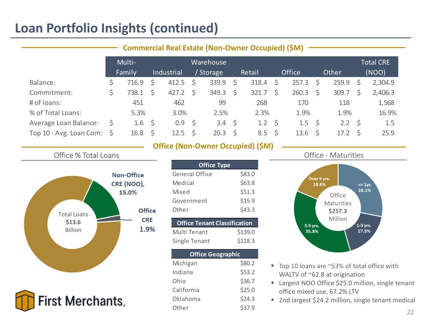 ($M) Balance Commit. % CRE Construction3 Commit. QoQ $ Change Multi-Family 458$ 856$ 71.1% (77)$ Industrial 70$ 124$ 10.8% 7$ Self Storage 27$ 57$ 4.2% (8)$ $911.1 million in loans to 100 companies in a diversity of industries Senior Debt/Adj. EBITDA < 3.0X ~84% Total Debt/Adj. EBITDA < 4.0X ~76% FCCR > 1.50X ~63% ~4.3% Classified (as a % of portfolio) Excellent credit history with ~$15.1 million in total losses on ~$1.96 billion of funded loans over 10-year history of groupC&I Includes commercial and industrial, sponsor and owner- occupied real estate loans C&I - Sponsor Finance Line utilization 3Q25 at 50.0% from 50.6% 2Q25 Shared National Credits: • $1.1 billion to 94 borrowers, $11.6 million average balance • Top borrowers in Manufacturing, Wholesale Trade, Agriculture, and Rental and Leasing $40.2 million of SBA guaranteed loans Loan Portfolio Insights 21 C&I $145 million Resi. Real Estate Construction $644 million CRE Construction3 Construction Finance Home Equity / Other Consumer Residential Mortgage > 95.6% of $726.6 million in consumer loans had a credit score exceeding 669 at origination1 $239.0 million residential mortgage secured, related to commercial loan relationships ~$2.2 billion residential mortgage loans • > 91.5% of $1.9 billion in residential portfolio loans had a credit score at origination exceeding 6692 Commercial Mortgage & Consumer 1Excludes ~12% of loans where origination data is unavailable 2Excludes ~12% of residential loans where origination data is unavailable 3Includes Construction, Land, & Land Development