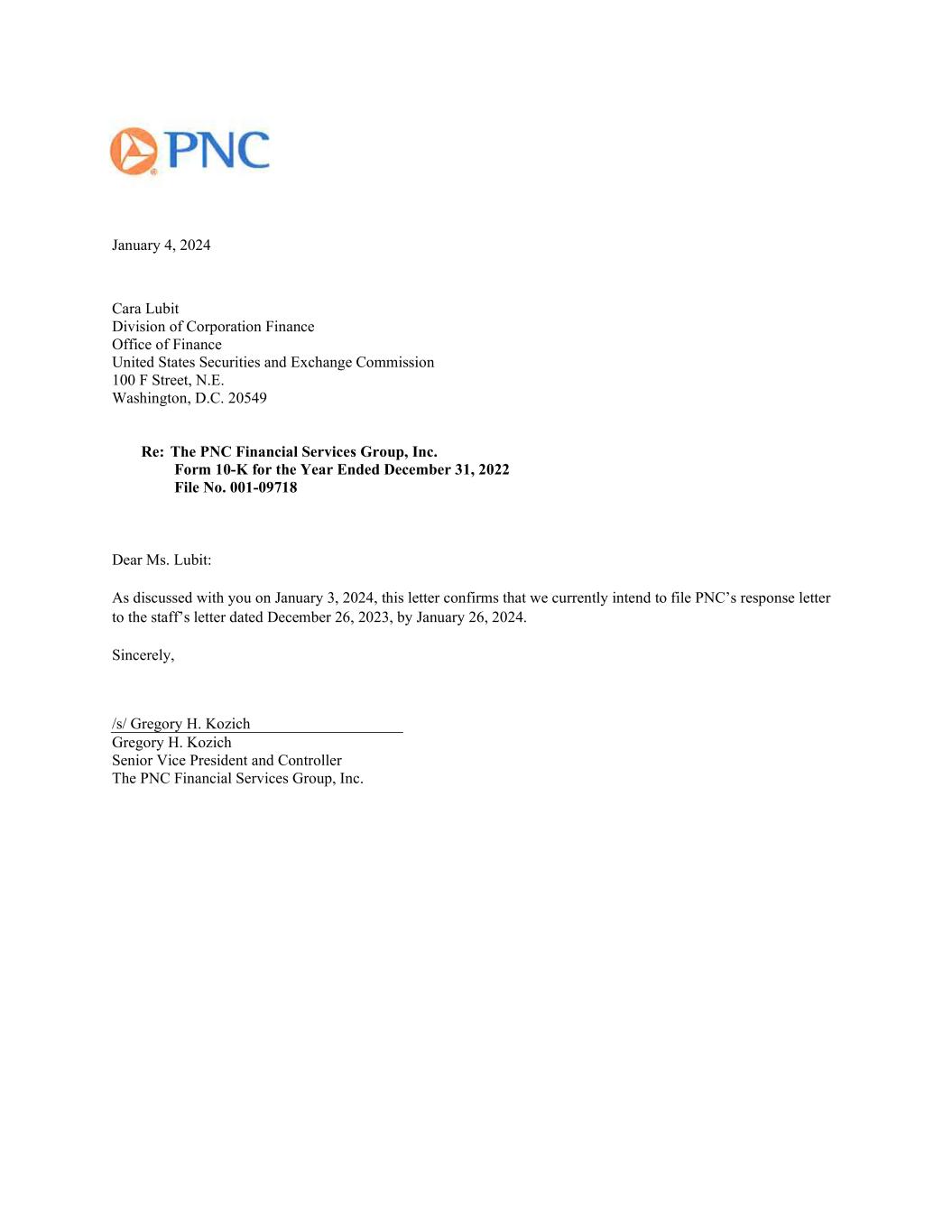January 4, 2024 Cara Lubit Division of Corporation Finance Office of Finance United States Securities and Exchange Commission 100 F Street, N.E. Washington, D.C. 20549 Re: The PNC Financial Services Group, Inc. Form 10-K for the Year Ended December 31, 2022 File No. 001-09718 Dear Ms. Lubit: As discussed with you on January 3, 2024, this letter confirms that we currently intend to file PNC’s response letter to the staff’s letter dated December 26, 2023, by January 26, 2024. Sincerely, /s/ Gregory H. Kozich Gregory H. Kozich Senior Vice President and Controller The PNC Financial Services Group, Inc.