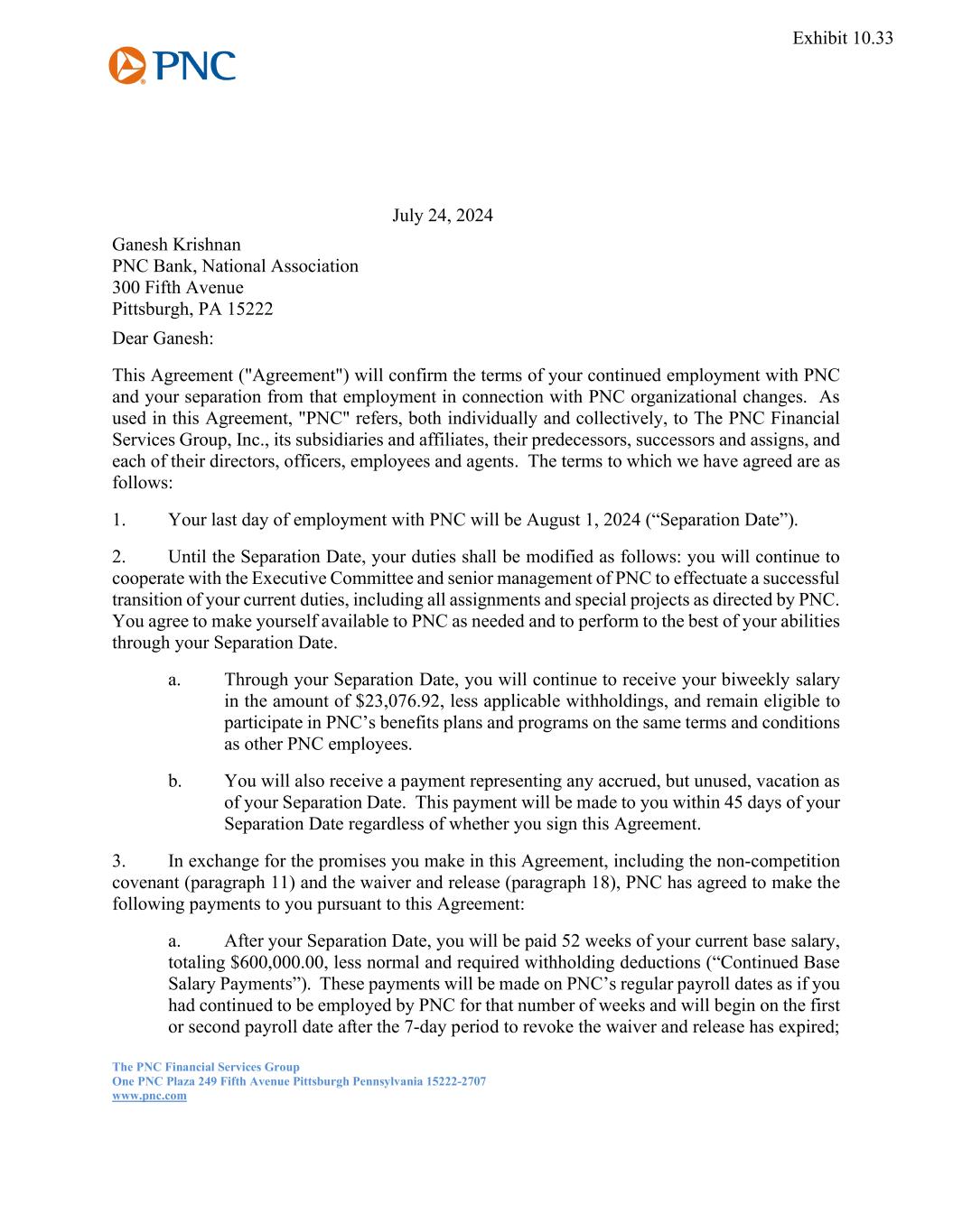 The PNC Financial Services Group One PNC Plaza 249 Fifth Avenue Pittsburgh Pennsylvania 15222-2707 www.pnc.com July 24, 2024 Ganesh Krishnan PNC Bank, National Association 300 Fifth Avenue Pittsburgh, PA 15222 Dear Ganesh: This Agreement ("Agreement") will confirm the terms of your continued employment with PNC and your separation from that employment in connection with PNC organizational changes. As used in this Agreement, "PNC" refers, both individually and collectively, to The PNC Financial Services Group, Inc., its subsidiaries and affiliates, their predecessors, successors and assigns, and each of their directors, officers, employees and agents. The terms to which we have agreed are as follows: 1. Your last day of employment with PNC will be August 1, 2024 (“Separation Date”). 2. Until the Separation Date, your duties shall be modified as follows: you will continue to cooperate with the Executive Committee and senior management of PNC to effectuate a successful transition of your current duties, including all assignments and special projects as directed by PNC. You agree to make yourself available to PNC as needed and to perform to the best of your abilities through your Separation Date. a. Through your Separation Date, you will continue to receive your biweekly salary in the amount of $23,076.92, less applicable withholdings, and remain eligible to participate in PNC’s benefits plans and programs on the same terms and conditions as other PNC employees. b. You will also receive a payment representing any accrued, but unused, vacation as of your Separation Date. This payment will be made to you within 45 days of your Separation Date regardless of whether you sign this Agreement. 3. In exchange for the promises you make in this Agreement, including the non-competition covenant (paragraph 11) and the waiver and release (paragraph 18), PNC has agreed to make the following payments to you pursuant to this Agreement: a. After your Separation Date, you will be paid 52 weeks of your current base salary, totaling $600,000.00, less normal and required withholding deductions (“Continued Base Salary Payments”). These payments will be made on PNC’s regular payroll dates as if you had continued to be employed by PNC for that number of weeks and will begin on the first or second payroll date after the 7-day period to revoke the waiver and release has expired; Exhibit 10.33