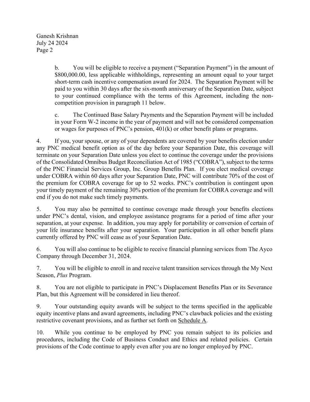 Ganesh Krishnan July 24 2024 Page 2 b. You will be eligible to receive a payment (“Separation Payment”) in the amount of $800,000.00, less applicable withholdings, representing an amount equal to your target short-term cash incentive compensation award for 2024. The Separation Payment will be paid to you within 30 days after the six-month anniversary of the Separation Date, subject to your continued compliance with the terms of this Agreement, including the non- competition provision in paragraph 11 below. c. The Continued Base Salary Payments and the Separation Payment will be included in your Form W-2 income in the year of payment and will not be considered compensation or wages for purposes of PNC’s pension, 401(k) or other benefit plans or programs. 4. If you, your spouse, or any of your dependents are covered by your benefits election under any PNC medical benefit option as of the day before your Separation Date, this coverage will terminate on your Separation Date unless you elect to continue the coverage under the provisions of the Consolidated Omnibus Budget Reconciliation Act of 1985 (“COBRA”), subject to the terms of the PNC Financial Services Group, Inc. Group Benefits Plan. If you elect medical coverage under COBRA within 60 days after your Separation Date, PNC will contribute 70% of the cost of the premium for COBRA coverage for up to 52 weeks. PNC’s contribution is contingent upon your timely payment of the remaining 30% portion of the premium for COBRA coverage and will end if you do not make such timely payments. 5. You may also be permitted to continue coverage made through your benefits elections under PNC’s dental, vision, and employee assistance programs for a period of time after your separation, at your expense. In addition, you may apply for portability or conversion of certain of your life insurance benefits after your separation. Your participation in all other benefit plans currently offered by PNC will cease as of your Separation Date. 6. You will also continue to be eligible to receive financial planning services from The Ayco Company through December 31, 2024. 7. You will be eligible to enroll in and receive talent transition services through the My Next Season, Plus Program. 8. You are not eligible to participate in PNC’s Displacement Benefits Plan or its Severance Plan, but this Agreement will be considered in lieu thereof. 9. Your outstanding equity awards will be subject to the terms specified in the applicable equity incentive plans and award agreements, including PNC’s clawback policies and the existing restrictive covenant provisions, and as further set forth on Schedule A. 10. While you continue to be employed by PNC you remain subject to its policies and procedures, including the Code of Business Conduct and Ethics and related policies. Certain provisions of the Code continue to apply even after you are no longer employed by PNC.