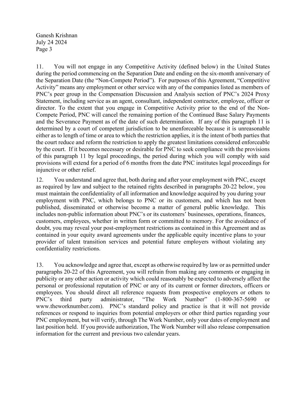 Ganesh Krishnan July 24 2024 Page 3 11. You will not engage in any Competitive Activity (defined below) in the United States during the period commencing on the Separation Date and ending on the six-month anniversary of the Separation Date (the “Non-Compete Period”). For purposes of this Agreement, “Competitive Activity” means any employment or other service with any of the companies listed as members of PNC’s peer group in the Compensation Discussion and Analysis section of PNC’s 2024 Proxy Statement, including service as an agent, consultant, independent contractor, employee, officer or director. To the extent that you engage in Competitive Activity prior to the end of the Non- Compete Period, PNC will cancel the remaining portion of the Continued Base Salary Payments and the Severance Payment as of the date of such determination. If any of this paragraph 11 is determined by a court of competent jurisdiction to be unenforceable because it is unreasonable either as to length of time or area to which the restriction applies, it is the intent of both parties that the court reduce and reform the restriction to apply the greatest limitations considered enforceable by the court. If it becomes necessary or desirable for PNC to seek compliance with the provisions of this paragraph 11 by legal proceedings, the period during which you will comply with said provisions will extend for a period of 6 months from the date PNC institutes legal proceedings for injunctive or other relief. 12. You understand and agree that, both during and after your employment with PNC, except as required by law and subject to the retained rights described in paragraphs 20-22 below, you must maintain the confidentiality of all information and knowledge acquired by you during your employment with PNC, which belongs to PNC or its customers, and which has not been published, disseminated or otherwise become a matter of general public knowledge. This includes non-public information about PNC’s or its customers’ businesses, operations, finances, customers, employees, whether in written form or committed to memory. For the avoidance of doubt, you may reveal your post-employment restrictions as contained in this Agreement and as contained in your equity award agreements under the applicable equity incentive plans to your provider of talent transition services and potential future employers without violating any confidentiality restrictions. 13. You acknowledge and agree that, except as otherwise required by law or as permitted under paragraphs 20-22 of this Agreement, you will refrain from making any comments or engaging in publicity or any other action or activity which could reasonably be expected to adversely affect the personal or professional reputation of PNC or any of its current or former directors, officers or employees. You should direct all reference requests from prospective employers or others to PNC’s third party administrator, “The Work Number” (1-800-367-5690 or www.theworknumber.com). PNC’s standard policy and practice is that it will not provide references or respond to inquiries from potential employers or other third parties regarding your PNC employment, but will verify, through The Work Number, only your dates of employment and last position held. If you provide authorization, The Work Number will also release compensation information for the current and previous two calendar years.