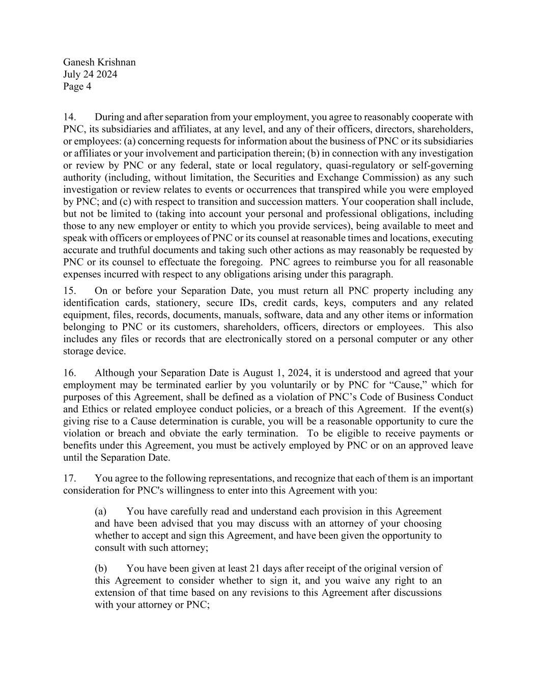 Ganesh Krishnan July 24 2024 Page 4 14. During and after separation from your employment, you agree to reasonably cooperate with PNC, its subsidiaries and affiliates, at any level, and any of their officers, directors, shareholders, or employees: (a) concerning requests for information about the business of PNC or its subsidiaries or affiliates or your involvement and participation therein; (b) in connection with any investigation or review by PNC or any federal, state or local regulatory, quasi-regulatory or self-governing authority (including, without limitation, the Securities and Exchange Commission) as any such investigation or review relates to events or occurrences that transpired while you were employed by PNC; and (c) with respect to transition and succession matters. Your cooperation shall include, but not be limited to (taking into account your personal and professional obligations, including those to any new employer or entity to which you provide services), being available to meet and speak with officers or employees of PNC or its counsel at reasonable times and locations, executing accurate and truthful documents and taking such other actions as may reasonably be requested by PNC or its counsel to effectuate the foregoing. PNC agrees to reimburse you for all reasonable expenses incurred with respect to any obligations arising under this paragraph. 15. On or before your Separation Date, you must return all PNC property including any identification cards, stationery, secure IDs, credit cards, keys, computers and any related equipment, files, records, documents, manuals, software, data and any other items or information belonging to PNC or its customers, shareholders, officers, directors or employees. This also includes any files or records that are electronically stored on a personal computer or any other storage device. 16. Although your Separation Date is August 1, 2024, it is understood and agreed that your employment may be terminated earlier by you voluntarily or by PNC for “Cause,” which for purposes of this Agreement, shall be defined as a violation of PNC’s Code of Business Conduct and Ethics or related employee conduct policies, or a breach of this Agreement. If the event(s) giving rise to a Cause determination is curable, you will be a reasonable opportunity to cure the violation or breach and obviate the early termination. To be eligible to receive payments or benefits under this Agreement, you must be actively employed by PNC or on an approved leave until the Separation Date. 17. You agree to the following representations, and recognize that each of them is an important consideration for PNC's willingness to enter into this Agreement with you: (a) You have carefully read and understand each provision in this Agreement and have been advised that you may discuss with an attorney of your choosing whether to accept and sign this Agreement, and have been given the opportunity to consult with such attorney; (b) You have been given at least 21 days after receipt of the original version of this Agreement to consider whether to sign it, and you waive any right to an extension of that time based on any revisions to this Agreement after discussions with your attorney or PNC;