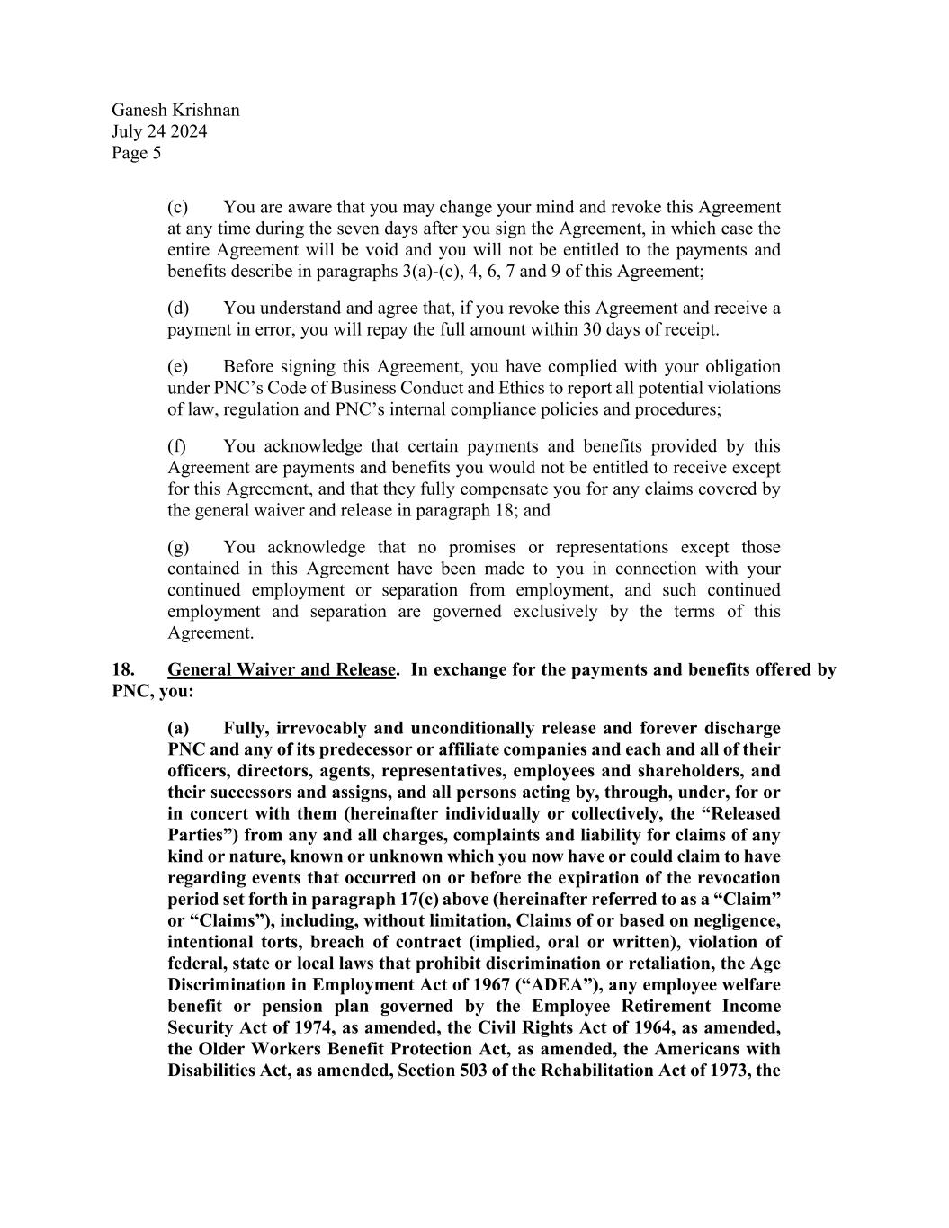 Ganesh Krishnan July 24 2024 Page 5 (c) You are aware that you may change your mind and revoke this Agreement at any time during the seven days after you sign the Agreement, in which case the entire Agreement will be void and you will not be entitled to the payments and benefits describe in paragraphs 3(a)-(c), 4, 6, 7 and 9 of this Agreement; (d) You understand and agree that, if you revoke this Agreement and receive a payment in error, you will repay the full amount within 30 days of receipt. (e) Before signing this Agreement, you have complied with your obligation under PNC’s Code of Business Conduct and Ethics to report all potential violations of law, regulation and PNC’s internal compliance policies and procedures; (f) You acknowledge that certain payments and benefits provided by this Agreement are payments and benefits you would not be entitled to receive except for this Agreement, and that they fully compensate you for any claims covered by the general waiver and release in paragraph 18; and (g) You acknowledge that no promises or representations except those contained in this Agreement have been made to you in connection with your continued employment or separation from employment, and such continued employment and separation are governed exclusively by the terms of this Agreement. 18. General Waiver and Release. In exchange for the payments and benefits offered by PNC, you: (a) Fully, irrevocably and unconditionally release and forever discharge PNC and any of its predecessor or affiliate companies and each and all of their officers, directors, agents, representatives, employees and shareholders, and their successors and assigns, and all persons acting by, through, under, for or in concert with them (hereinafter individually or collectively, the “Released Parties”) from any and all charges, complaints and liability for claims of any kind or nature, known or unknown which you now have or could claim to have regarding events that occurred on or before the expiration of the revocation period set forth in paragraph 17(c) above (hereinafter referred to as a “Claim” or “Claims”), including, without limitation, Claims of or based on negligence, intentional torts, breach of contract (implied, oral or written), violation of federal, state or local laws that prohibit discrimination or retaliation, the Age Discrimination in Employment Act of 1967 (“ADEA”), any employee welfare benefit or pension plan governed by the Employee Retirement Income Security Act of 1974, as amended, the Civil Rights Act of 1964, as amended, the Older Workers Benefit Protection Act, as amended, the Americans with Disabilities Act, as amended, Section 503 of the Rehabilitation Act of 1973, the
