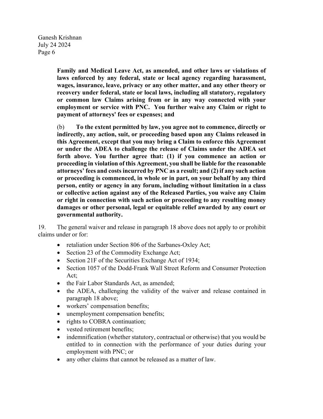 Ganesh Krishnan July 24 2024 Page 6 Family and Medical Leave Act, as amended, and other laws or violations of laws enforced by any federal, state or local agency regarding harassment, wages, insurance, leave, privacy or any other matter, and any other theory or recovery under federal, state or local laws, including all statutory, regulatory or common law Claims arising from or in any way connected with your employment or service with PNC. You further waive any Claim or right to payment of attorneys' fees or expenses; and (b) To the extent permitted by law, you agree not to commence, directly or indirectly, any action, suit, or proceeding based upon any Claims released in this Agreement, except that you may bring a Claim to enforce this Agreement or under the ADEA to challenge the release of Claims under the ADEA set forth above. You further agree that: (1) if you commence an action or proceeding in violation of this Agreement, you shall be liable for the reasonable attorneys’ fees and costs incurred by PNC as a result; and (2) if any such action or proceeding is commenced, in whole or in part, on your behalf by any third person, entity or agency in any forum, including without limitation in a class or collective action against any of the Released Parties, you waive any Claim or right in connection with such action or proceeding to any resulting money damages or other personal, legal or equitable relief awarded by any court or governmental authority. 19. The general waiver and release in paragraph 18 above does not apply to or prohibit claims under or for: retaliation under Section 806 of the Sarbanes-Oxley Act; Section 23 of the Commodity Exchange Act; Section 21F of the Securities Exchange Act of 1934; Section 1057 of the Dodd-Frank Wall Street Reform and Consumer Protection Act; the Fair Labor Standards Act, as amended; the ADEA, challenging the validity of the waiver and release contained in paragraph 18 above; workers’ compensation benefits; unemployment compensation benefits; rights to COBRA continuation; vested retirement benefits; indemnification (whether statutory, contractual or otherwise) that you would be entitled to in connection with the performance of your duties during your employment with PNC; or any other claims that cannot be released as a matter of law.