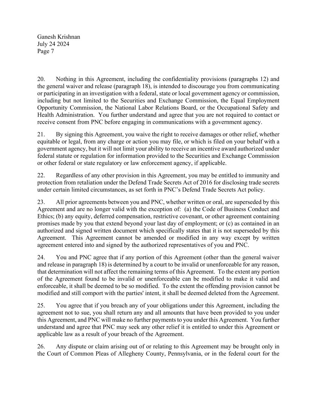 Ganesh Krishnan July 24 2024 Page 7 20. Nothing in this Agreement, including the confidentiality provisions (paragraphs 12) and the general waiver and release (paragraph 18), is intended to discourage you from communicating or participating in an investigation with a federal, state or local government agency or commission, including but not limited to the Securities and Exchange Commission, the Equal Employment Opportunity Commission, the National Labor Relations Board, or the Occupational Safety and Health Administration. You further understand and agree that you are not required to contact or receive consent from PNC before engaging in communications with a government agency. 21. By signing this Agreement, you waive the right to receive damages or other relief, whether equitable or legal, from any charge or action you may file, or which is filed on your behalf with a government agency, but it will not limit your ability to receive an incentive award authorized under federal statute or regulation for information provided to the Securities and Exchange Commission or other federal or state regulatory or law enforcement agency, if applicable. 22. Regardless of any other provision in this Agreement, you may be entitled to immunity and protection from retaliation under the Defend Trade Secrets Act of 2016 for disclosing trade secrets under certain limited circumstances, as set forth in PNC’s Defend Trade Secrets Act policy. 23. All prior agreements between you and PNC, whether written or oral, are superseded by this Agreement and are no longer valid with the exception of: (a) the Code of Business Conduct and Ethics; (b) any equity, deferred compensation, restrictive covenant, or other agreement containing promises made by you that extend beyond your last day of employment; or (c) as contained in an authorized and signed written document which specifically states that it is not superseded by this Agreement. This Agreement cannot be amended or modified in any way except by written agreement entered into and signed by the authorized representatives of you and PNC. 24. You and PNC agree that if any portion of this Agreement (other than the general waiver and release in paragraph 18) is determined by a court to be invalid or unenforceable for any reason, that determination will not affect the remaining terms of this Agreement. To the extent any portion of the Agreement found to be invalid or unenforceable can be modified to make it valid and enforceable, it shall be deemed to be so modified. To the extent the offending provision cannot be modified and still comport with the parties' intent, it shall be deemed deleted from the Agreement. 25. You agree that if you breach any of your obligations under this Agreement, including the agreement not to sue, you shall return any and all amounts that have been provided to you under this Agreement, and PNC will make no further payments to you under this Agreement. You further understand and agree that PNC may seek any other relief it is entitled to under this Agreement or applicable law as a result of your breach of the Agreement. 26. Any dispute or claim arising out of or relating to this Agreement may be brought only in the Court of Common Pleas of Allegheny County, Pennsylvania, or in the federal court for the