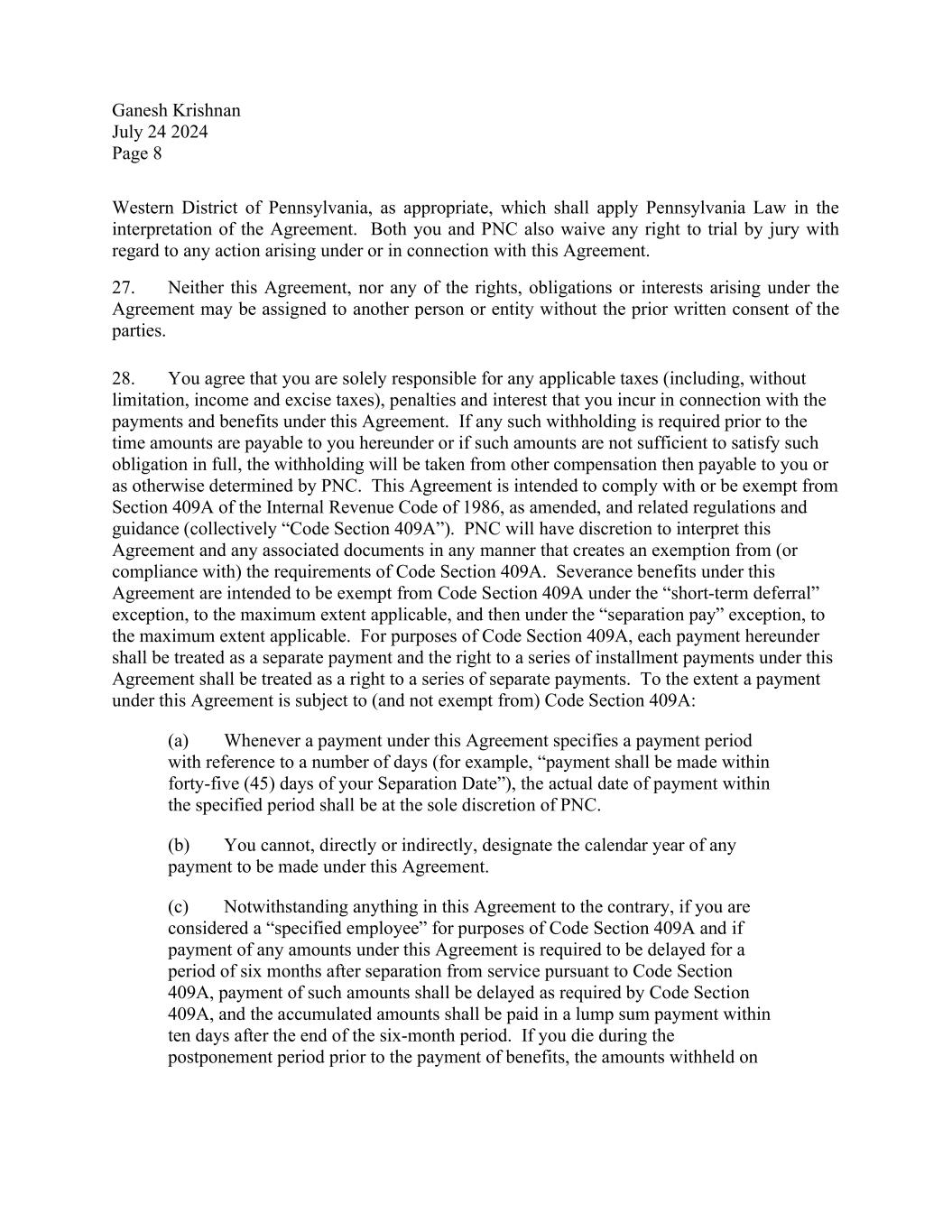 Ganesh Krishnan July 24 2024 Page 8 Western District of Pennsylvania, as appropriate, which shall apply Pennsylvania Law in the interpretation of the Agreement. Both you and PNC also waive any right to trial by jury with regard to any action arising under or in connection with this Agreement. 27. Neither this Agreement, nor any of the rights, obligations or interests arising under the Agreement may be assigned to another person or entity without the prior written consent of the parties. 28. You agree that you are solely responsible for any applicable taxes (including, without limitation, income and excise taxes), penalties and interest that you incur in connection with the payments and benefits under this Agreement. If any such withholding is required prior to the time amounts are payable to you hereunder or if such amounts are not sufficient to satisfy such obligation in full, the withholding will be taken from other compensation then payable to you or as otherwise determined by PNC. This Agreement is intended to comply with or be exempt from Section 409A of the Internal Revenue Code of 1986, as amended, and related regulations and guidance (collectively “Code Section 409A”). PNC will have discretion to interpret this Agreement and any associated documents in any manner that creates an exemption from (or compliance with) the requirements of Code Section 409A. Severance benefits under this Agreement are intended to be exempt from Code Section 409A under the “short-term deferral” exception, to the maximum extent applicable, and then under the “separation pay” exception, to the maximum extent applicable. For purposes of Code Section 409A, each payment hereunder shall be treated as a separate payment and the right to a series of installment payments under this Agreement shall be treated as a right to a series of separate payments. To the extent a payment under this Agreement is subject to (and not exempt from) Code Section 409A: (a) Whenever a payment under this Agreement specifies a payment period with reference to a number of days (for example, “payment shall be made within forty-five (45) days of your Separation Date”), the actual date of payment within the specified period shall be at the sole discretion of PNC. (b) You cannot, directly or indirectly, designate the calendar year of any payment to be made under this Agreement. (c) Notwithstanding anything in this Agreement to the contrary, if you are considered a “specified employee” for purposes of Code Section 409A and if payment of any amounts under this Agreement is required to be delayed for a period of six months after separation from service pursuant to Code Section 409A, payment of such amounts shall be delayed as required by Code Section 409A, and the accumulated amounts shall be paid in a lump sum payment within ten days after the end of the six-month period. If you die during the postponement period prior to the payment of benefits, the amounts withheld on