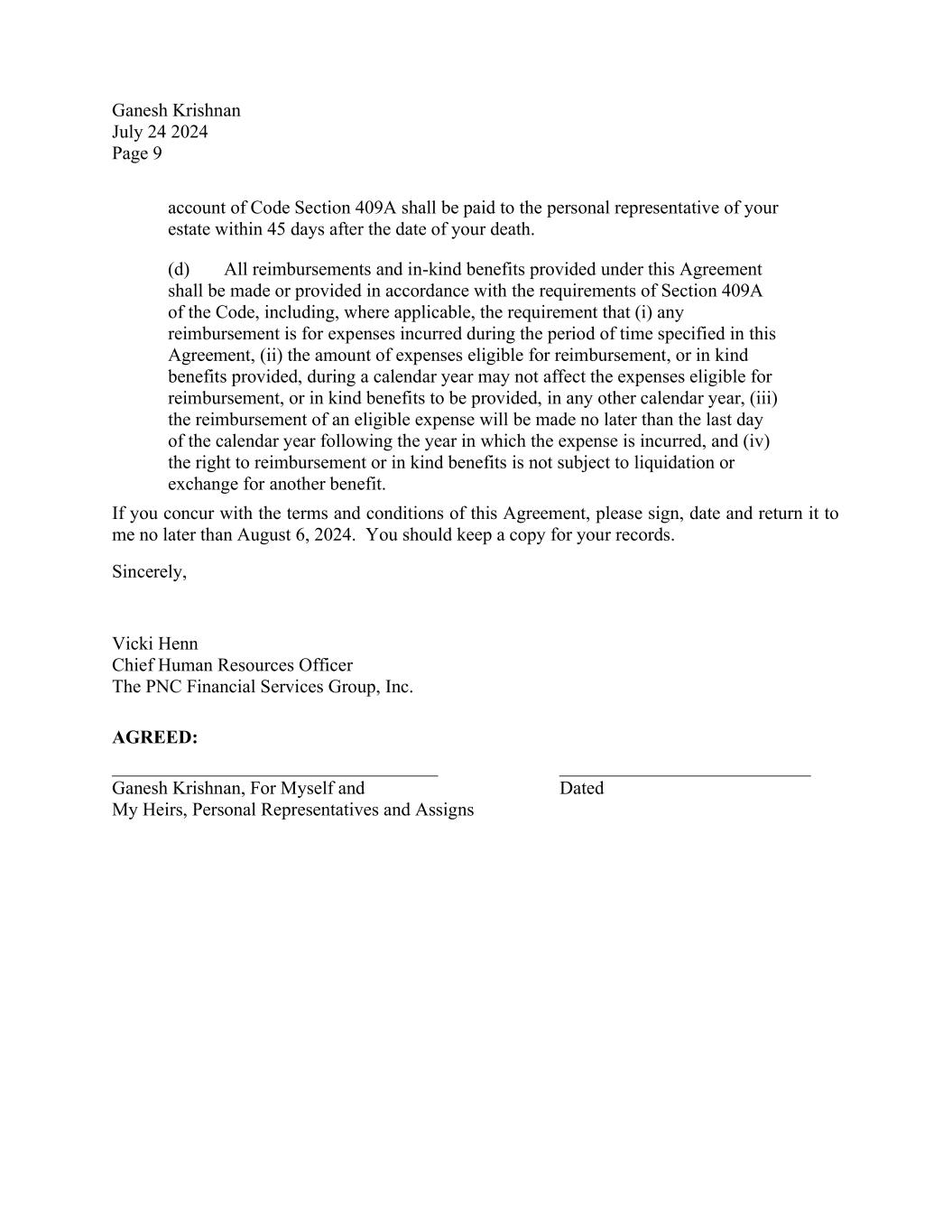Ganesh Krishnan July 24 2024 Page 9 account of Code Section 409A shall be paid to the personal representative of your estate within 45 days after the date of your death. (d) All reimbursements and in-kind benefits provided under this Agreement shall be made or provided in accordance with the requirements of Section 409A of the Code, including, where applicable, the requirement that (i) any reimbursement is for expenses incurred during the period of time specified in this Agreement, (ii) the amount of expenses eligible for reimbursement, or in kind benefits provided, during a calendar year may not affect the expenses eligible for reimbursement, or in kind benefits to be provided, in any other calendar year, (iii) the reimbursement of an eligible expense will be made no later than the last day of the calendar year following the year in which the expense is incurred, and (iv) the right to reimbursement or in kind benefits is not subject to liquidation or exchange for another benefit. If you concur with the terms and conditions of this Agreement, please sign, date and return it to me no later than August 6, 2024. You should keep a copy for your records. Sincerely, Vicki Henn Chief Human Resources Officer The PNC Financial Services Group, Inc. AGREED: ___________________________________ ___________________________ Ganesh Krishnan, For Myself and Dated My Heirs, Personal Representatives and Assigns