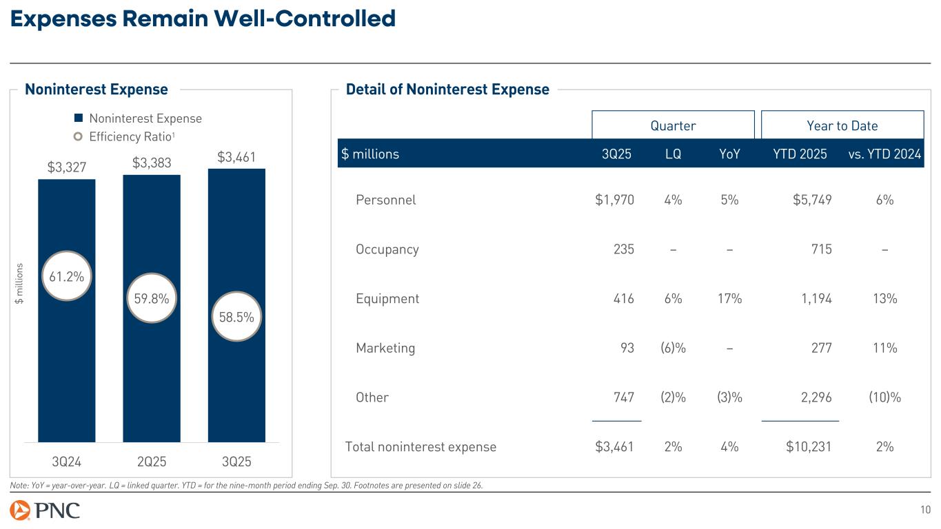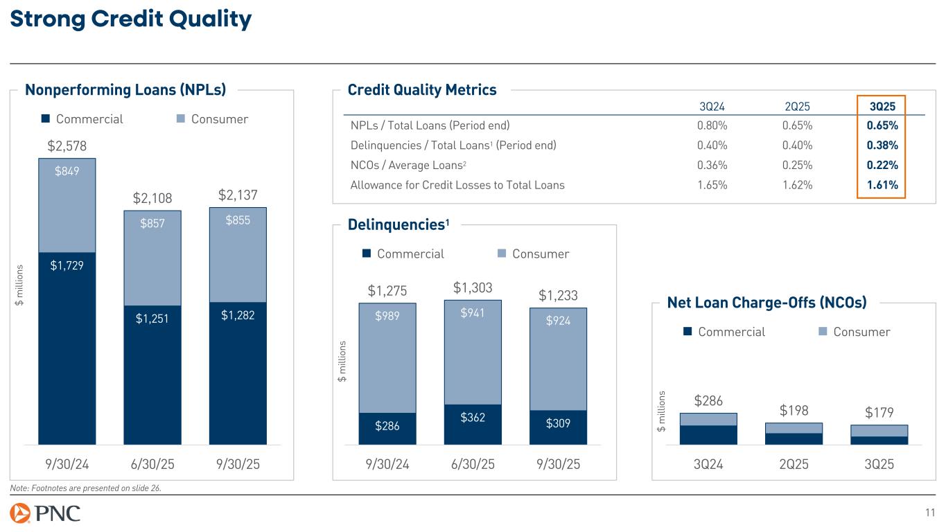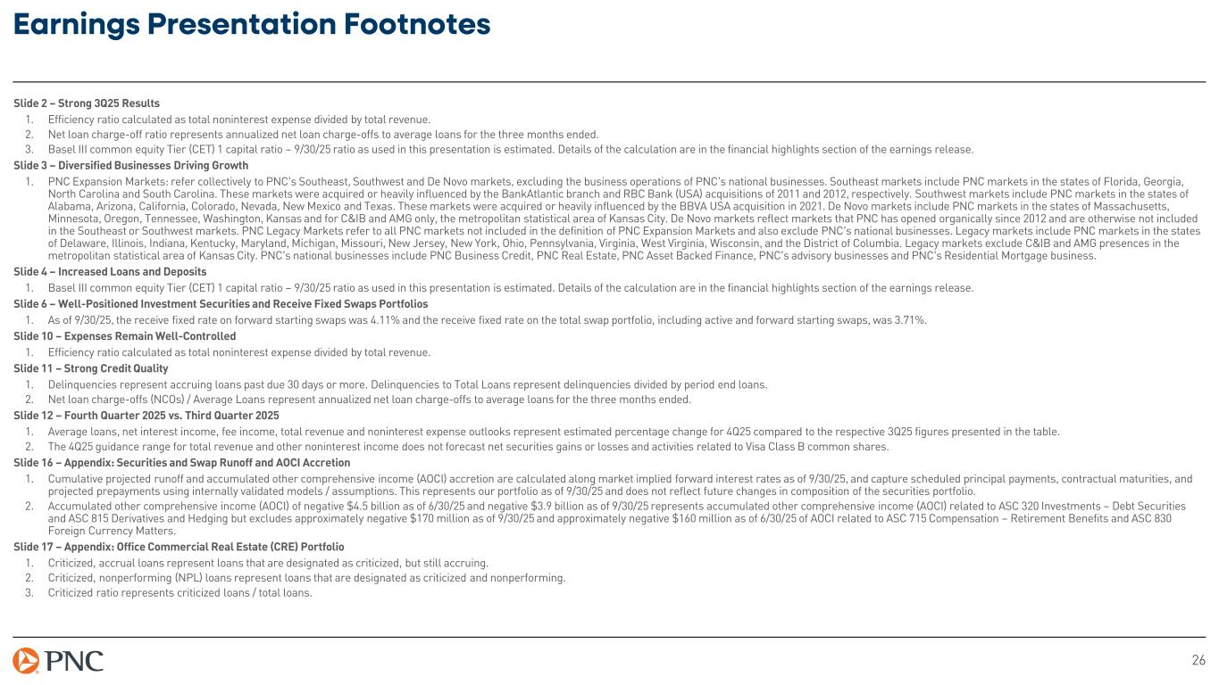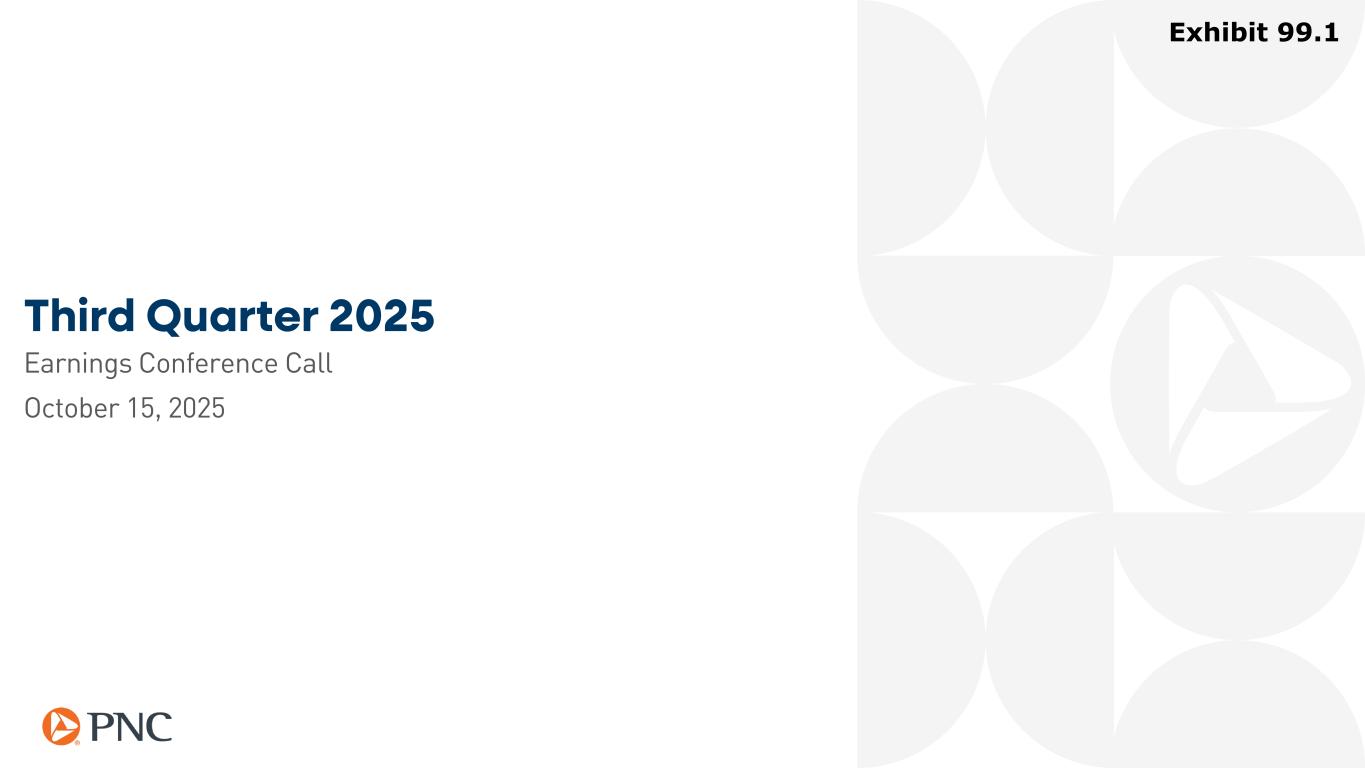 26 Earnings Presentation Footnotes Slide 2 – Strong 3Q25 Results 1. Efficiency ratio calculated as total noninterest expense divided by total revenue. 2. Net loan charge-off ratio represents annualized net loan charge-offs to average loans for the three months ended. 3. Basel III common equity Tier (CET) 1 capital ratio – 9/30/25 ratio as used in this presentation is estimated. Details of the calculation are in the financial highlights section of the earnings release. Slide 3 – Diversified Businesses Driving Growth 1. PNC Expansion Markets: refer collectively to PNC’s Southeast, Southwest and De Novo markets, excluding the business operations of PNC’s national businesses. Southeast markets include PNC markets in the states of Florida, Georgia,  North Carolina and South Carolina. These markets were acquired or heavily influenced by the BankAtlantic branch and RBC Bank (USA) acquisitions of 2011 and 2012, respectively. Southwest markets include PNC markets in the states of  Alabama, Arizona, California, Colorado, Nevada, New Mexico and Texas. These markets were acquired or heavily influenced by the BBVA USA acquisition in 2021. De Novo markets include PNC markets in the states of Massachusetts,  Minnesota, Oregon, Tennessee, Washington, Kansas and for C&IB and AMG only, the metropolitan statistical area of Kansas City. De Novo markets reflect markets that PNC has opened organically since 2012 and are otherwise not included  in the Southeast or Southwest markets. PNC Legacy Markets refer to all PNC markets not included in the definition of PNC Expansion Markets and also exclude PNC’s national businesses. Legacy markets include PNC markets in the states  of Delaware, Illinois, Indiana, Kentucky, Maryland, Michigan, Missouri, New Jersey, New York, Ohio, Pennsylvania, Virginia, West Virginia, Wisconsin, and the District of Columbia. Legacy markets exclude C&IB and AMG presences in the  metropolitan statistical area of Kansas City. PNC’s national businesses include PNC Business Credit, PNC Real Estate, PNC Asset Backed Finance, PNC’s advisory businesses and PNC’s Residential Mortgage business.  Slide 4 – Increased Loans and Deposits 1. Basel III common equity Tier (CET) 1 capital ratio – 9/30/25 ratio as used in this presentation is estimated. Details of the calculation are in the financial highlights section of the earnings release. Slide 6 – Well-Positioned Investment Securities and Receive Fixed Swaps Portfolios 1. As of 9/30/25, the receive fixed rate on forward starting swaps was 4.11% and the receive fixed rate on the total swap portfolio, including active and forward starting swaps, was 3.71%. Slide 10 – Expenses Remain Well-Controlled 1. Efficiency ratio calculated as total noninterest expense divided by total revenue.  Slide 11 – Strong Credit Quality 1. Delinquencies represent accruing loans past due 30 days or more. Delinquencies to Total Loans represent delinquencies divided by period end loans. 2. Net loan charge-offs (NCOs) / Average Loans represent annualized net loan charge-offs to average loans for the three months ended. Slide 12 – Fourth Quarter 2025 vs. Third Quarter 2025 1. Average loans, net interest income, fee income, total revenue and noninterest expense outlooks represent estimated percentage change for 4Q25 compared to the respective 3Q25 figures presented in the table. 2. The 4Q25 guidance range for total revenue and other noninterest income does not forecast net securities gains or losses and activities related to Visa Class B common shares. Slide 16 – Appendix: Securities and Swap Runoff and AOCI Accretion 1. Cumulative projected runoff and accumulated other comprehensive income (AOCI) accretion are calculated along market implied forward interest rates as of 9/30/25, and capture scheduled principal payments, contractual maturities, and  projected prepayments using internally validated models / assumptions. This represents our portfolio as of 9/30/25 and does not reflect future changes in composition of the securities portfolio. 2. Accumulated other comprehensive income (AOCI) of negative $4.5 billion as of 6/30/25 and negative $3.9 billion as of 9/30/25 represents accumulated other comprehensive income (AOCI) related to ASC 320 Investments – Debt Securities  and ASC 815 Derivatives and Hedging but excludes approximately negative $170 million as of 9/30/25 and approximately negative $160 million as of 6/30/25 of AOCI related to ASC 715 Compensation – Retirement Benefits and ASC 830  Foreign Currency Matters. Slide 17 – Appendix: Office Commercial Real Estate (CRE) Portfolio 1. Criticized, accrual loans represent loans that are designated as criticized, but still accruing.  2. Criticized, nonperforming (NPL) loans represent loans that are designated as criticized and nonperforming. 3. Criticized ratio represents criticized loans / total loans.