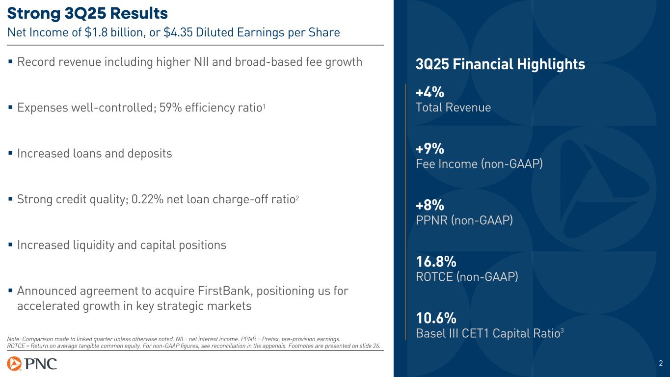 1 Cautionary Statement Regarding Forward-Looking and non-GAAP Financial Information Our earnings conference call presentation is not intended as a full business or financial review and should be viewed in the context of all of the information made available by PNC in its SEC filings and  on our corporate website.  The presentation contains forward-looking statements regarding our outlook for financial performance, such as earnings, revenues, expenses, tax rates, capital and liquidity levels and ratios, asset  levels, asset quality, financial position, and other matters regarding or affecting PNC and its future business and operations, including sustainability strategy. Forward-looking statements are  necessarily subject to numerous assumptions, risks and uncertainties, which change over time. The forward-looking statements in this presentation are qualified by the factors affecting forward- looking statements identified in the more detailed Cautionary Statement included in the Appendix. We provide greater detail regarding these as well as other factors in our most recent Form 10-K, any  subsequent Form 10-Qs, and any subsequent SEC filings. Our forward-looking statements may also be subject to risks and uncertainties including those we may discuss in this presentation or in our  SEC filings. Future events or circumstances may change our outlook and may also affect the nature of the assumptions, risks and uncertainties to which our forward-looking statements are subject.  Forward-looking statements in this presentation speak only as of the date of this presentation. We do not assume any duty and do not undertake any obligation to update those statements. Actual  results or future events could differ, possibly materially, from those anticipated in forward-looking statements, as well as from historical performance. As a result, we caution against placing undue  reliance on any forward-looking statements.  We include non-GAAP financial information in this presentation. Reconciliations for such financial information may be found in our presentation, in these slides, including the Appendix, in other  materials on our corporate website, and in our SEC filings. This information supplements our results as reported in accordance with GAAP and should not be viewed in isolation from, or as a substitute  for, our GAAP results. We believe that this information and the related reconciliations may be useful to investors, analysts, regulators and others to help understand and evaluate our financial results,  and with respect to adjusted metrics, because we believe they better reflect the ongoing financial results and trends of our businesses and increase comparability of period-to-period results. We may  also use annualized, pro forma, estimated or third party numbers for illustrative or comparative purposes only. These may not reflect actual results.  References to our corporate website are to www.pnc.com under “About - Investor Relations.” Our SEC filings are available both on our corporate website and on the SEC’s website at www.sec.gov. We  include web addresses here as inactive textual references only. Information on these websites is not part of this presentation.