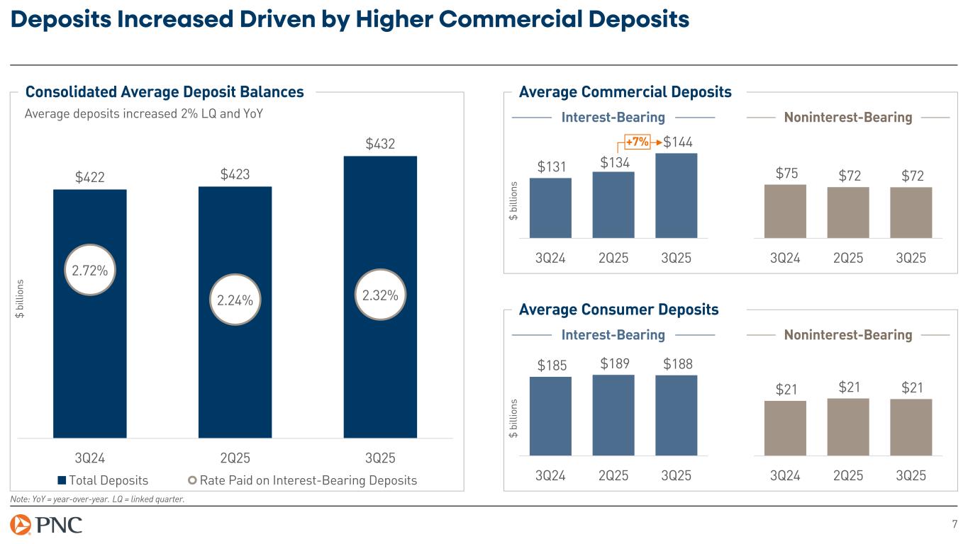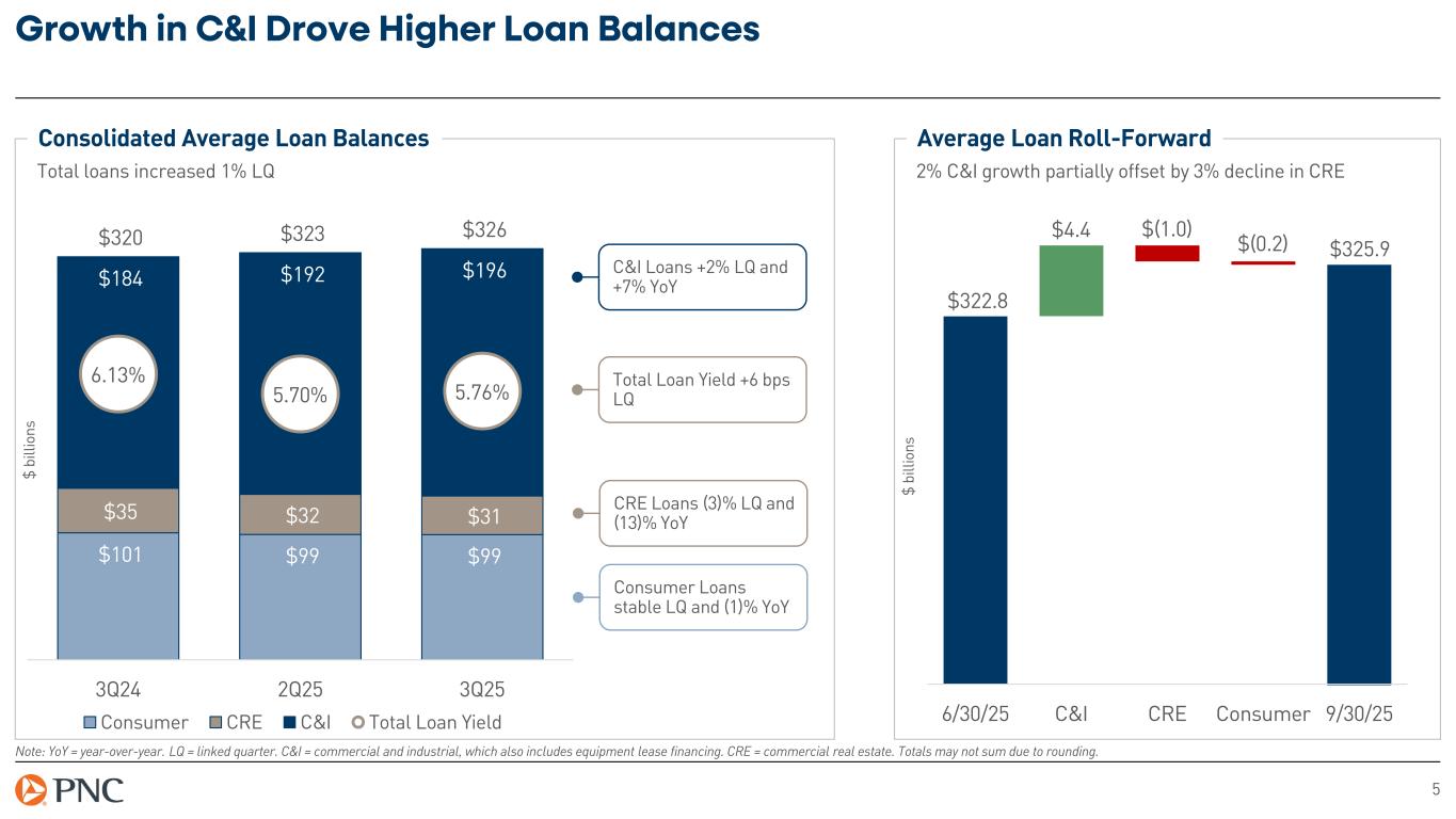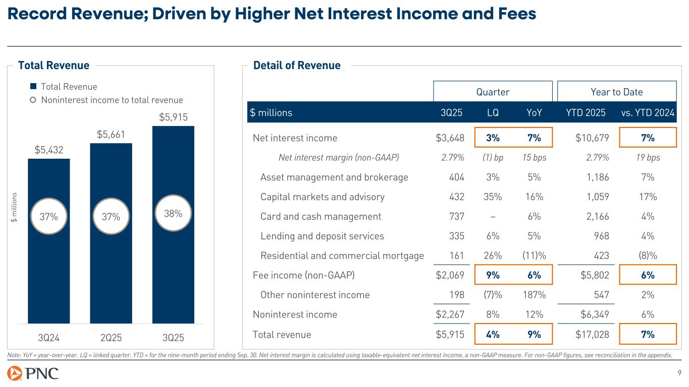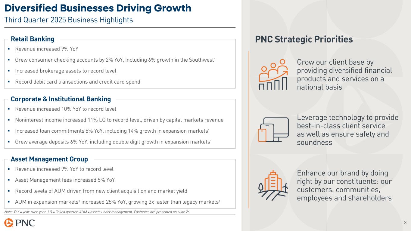 3 Diversified Businesses Driving Growth Third Quarter 2025 Business Highlights Note: YoY = year-over-year. LQ = linked quarter. AUM = assets under management. Footnotes are presented on slide 26.  Grow our client base by  providing diversified financial  products and services on a  national basis PNC Strategic Priorities Leverage technology to provide  best-in-class client service  as well as ensure safety and  soundness Enhance our brand by doing  right by our constituents: our  customers, communities,  employees and shareholders Corporate & Institutional Banking  Revenue increased 10% YoY to record level  Noninterest income increased 11% LQ to record level, driven by capital markets revenue  Increased loan commitments 5% YoY, including 14% growth in expansion markets1   Grew average deposits 6% YoY, including double digit growth in expansion markets1 Retail Banking  Revenue increased 9% YoY  Grew consumer checking accounts by 2% YoY, including 6% growth in the Southwest1  Increased brokerage assets to record level  Record debit card transactions and credit card spend Asset Management Group  Revenue increased 9% YoY to record level  Asset Management fees increased 5% YoY  Record levels of AUM driven from new client acquisition and market yield   AUM in expansion markets1 increased 25% YoY, growing 3x faster than legacy markets1