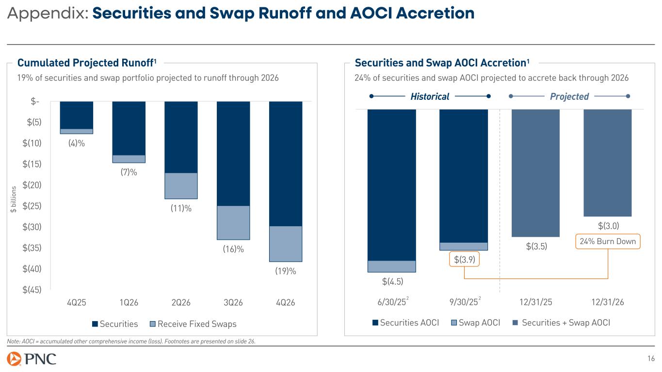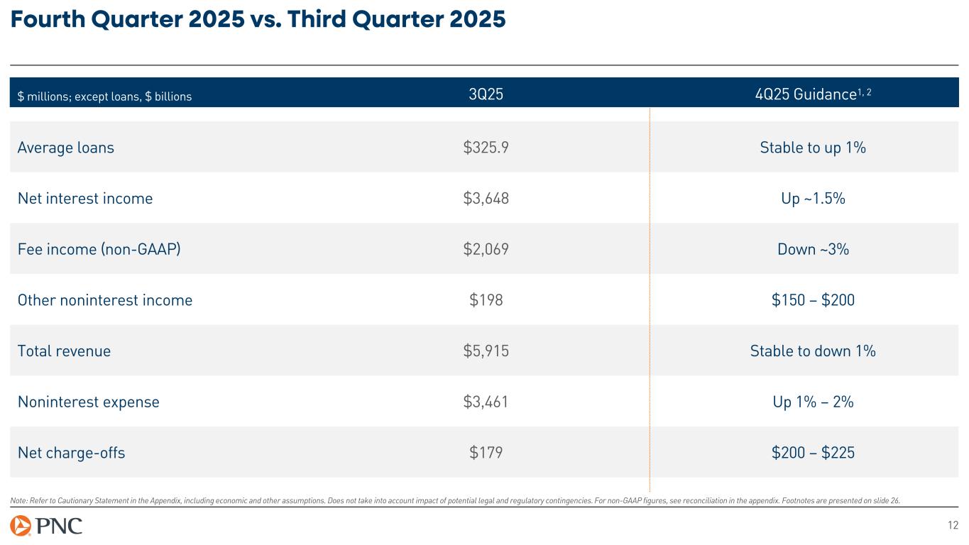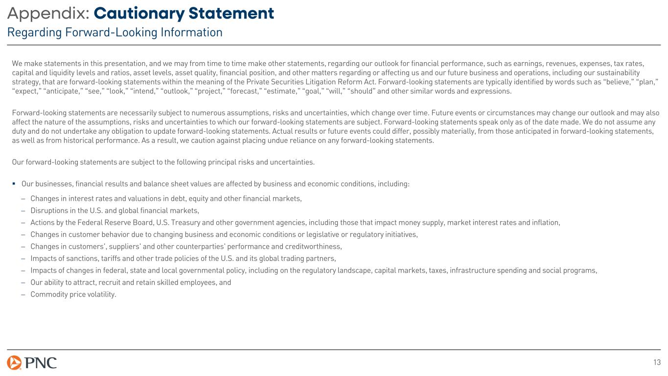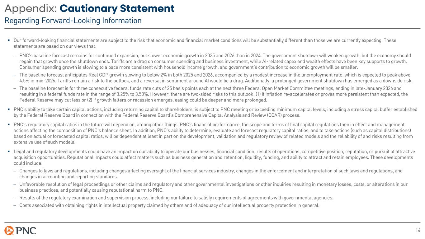14 Appendix: Cautionary Statement Regarding Forward-Looking Information  Our forward-looking financial statements are subject to the risk that economic and financial market conditions will be substantially different than those we are currently expecting. These  statements are based on our views that: − PNC’s baseline forecast remains for continued expansion, but slower economic growth in 2025 and 2026 than in 2024. The government shutdown will weaken growth, but the economy should  regain that growth once the shutdown ends. Tariffs are a drag on consumer spending and business investment, while AI-related capex and wealth effects have been key supports to growth.  Consumer spending growth is slowing to a pace more consistent with household income growth, and government’s contribution to economic growth will be smaller. − The baseline forecast anticipates Real GDP growth slowing to below 2% in both 2025 and 2026, accompanied by a modest increase in the unemployment rate, which is expected to peak above  4.5% in mid-2026. Tariffs remain a risk to the outlook, and a reversal in sentiment around AI would be a drag. Additionally, a prolonged government shutdown has emerged as a downside risk. − The baseline forecast is for three consecutive federal funds rate cuts of 25 basis points each at the next three Federal Open Market Committee meetings, ending in late-January 2026 and  resulting in a federal funds rate in the range of 3.25% to 3.50%. However, there are two-sided risks to this outlook: (1) if inflation re-accelerates or proves more persistent than expected, the  Federal Reserve may cut less or (2) if growth falters or recession emerges, easing could be deeper and more prolonged.  PNC's ability to take certain capital actions, including returning capital to shareholders, is subject to PNC meeting or exceeding minimum capital levels, including a stress capital buffer established  by the Federal Reserve Board in connection with the Federal Reserve Board's Comprehensive Capital Analysis and Review (CCAR) process.  PNC's regulatory capital ratios in the future will depend on, among other things, PNC's financial performance, the scope and terms of final capital regulations then in effect and management  actions affecting the composition of PNC's balance sheet. In addition, PNC's ability to determine, evaluate and forecast regulatory capital ratios, and to take actions (such as capital distributions)  based on actual or forecasted capital ratios, will be dependent at least in part on the development, validation and regulatory review of related models and the reliability of and risks resulting from  extensive use of such models.  Legal and regulatory developments could have an impact on our ability to operate our businesses, financial condition, results of operations, competitive position, reputation, or pursuit of attractive  acquisition opportunities. Reputational impacts could affect matters such as business generation and retention, liquidity, funding, and ability to attract and retain employees. These developments  could include: − Changes to laws and regulations, including changes affecting oversight of the financial services industry, changes in the enforcement and interpretation of such laws and regulations, and  changes in accounting and reporting standards. − Unfavorable resolution of legal proceedings or other claims and regulatory and other governmental investigations or other inquiries resulting in monetary losses, costs, or alterations in our  business practices, and potentially causing reputational harm to PNC. − Results of the regulatory examination and supervision process, including our failure to satisfy requirements of agreements with governmental agencies. − Costs associated with obtaining rights in intellectual property claimed by others and of adequacy of our intellectual property protection in general.