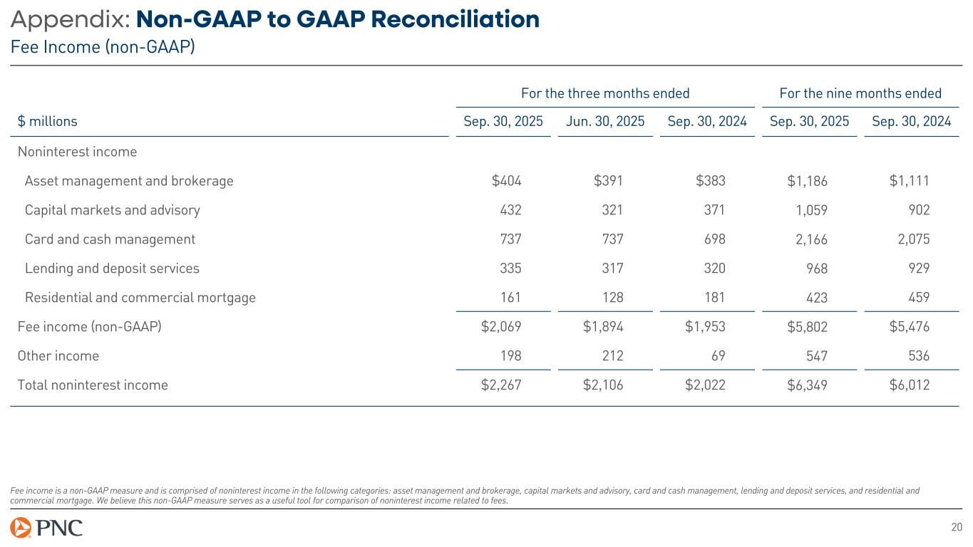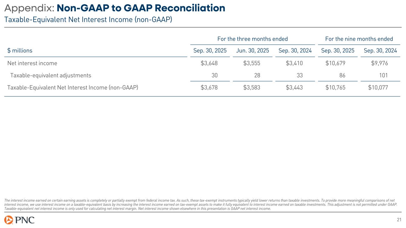 20 Appendix: Non-GAAP to GAAP Reconciliation Fee Income (non-GAAP) For the three months ended For the nine months ended $ millions Sep. 30, 2025 Jun. 30, 2025 Sep. 30, 2024 Sep. 30, 2025 Sep. 30, 2024 Noninterest income Asset management and brokerage $404 $391 $383 $1,186 $1,111 Capital markets and advisory 432 321 371 1,059 902 Card and cash management 737 737 698 2,166 2,075 Lending and deposit services 335 317 320 968 929 Residential and commercial mortgage 161 128 181 423 459 Fee income (non-GAAP) $2,069 $1,894 $1,953 $5,802 $5,476 Other income 198 212 69 547 536 Total noninterest income $2,267 $2,106 $2,022 $6,349 $6,012 Fee income is a non-GAAP measure and is comprised of noninterest income in the following categories: asset management and brokerage, capital markets and advisory, card and cash management, lending and deposit services, and residential and  commercial mortgage. We believe this non-GAAP measure serves as a useful tool for comparison of noninterest income related to fees.