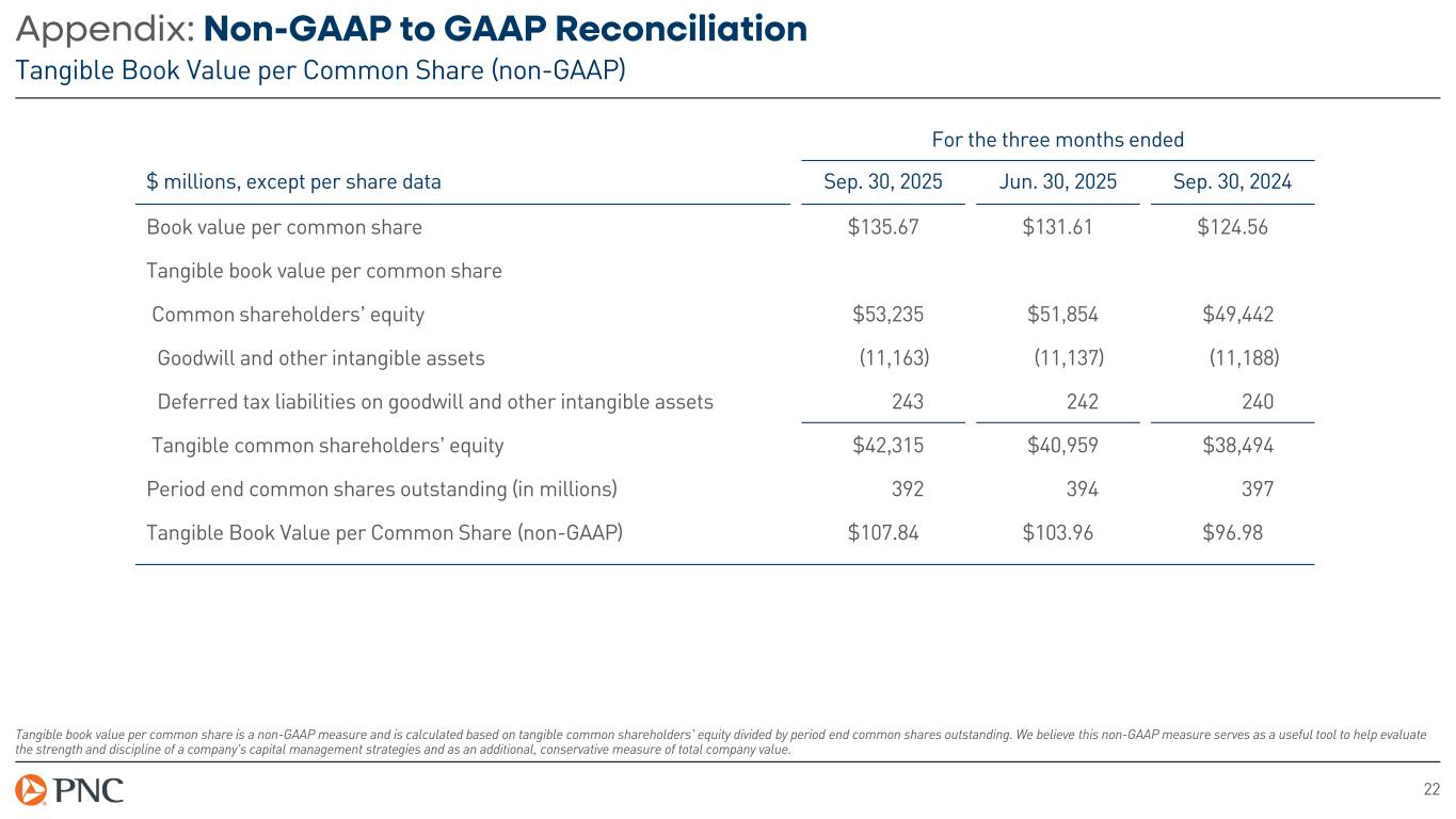 21 Appendix: Non-GAAP to GAAP Reconciliation Taxable-Equivalent Net Interest Income (non-GAAP) The interest income earned on certain earning assets is completely or partially exempt from federal income tax. As such, these tax-exempt instruments typically yield lower returns than taxable investments. To provide more meaningful comparisons of net  interest income, we use interest income on a taxable-equivalent basis by increasing the interest income earned on tax-exempt assets to make it fully equivalent to interest income earned on taxable investments. This adjustment is not permitted under GAAP.  Taxable-equivalent net interest income is only used for calculating net interest margin. Net interest income shown elsewhere in this presentation is GAAP net interest income. For the three months ended For the nine months ended $ millions Sep. 30, 2025 Jun. 30, 2025 Sep. 30, 2024 Sep. 30, 2025 Sep. 30, 2024 Net interest income $3,648 $3,555 $3,410 $10,679 $9,976 Taxable-equivalent adjustments 30 28 33 86 101 Taxable-Equivalent Net Interest Income (non-GAAP) $3,678 $3,583 $3,443 $10,765 $10,077