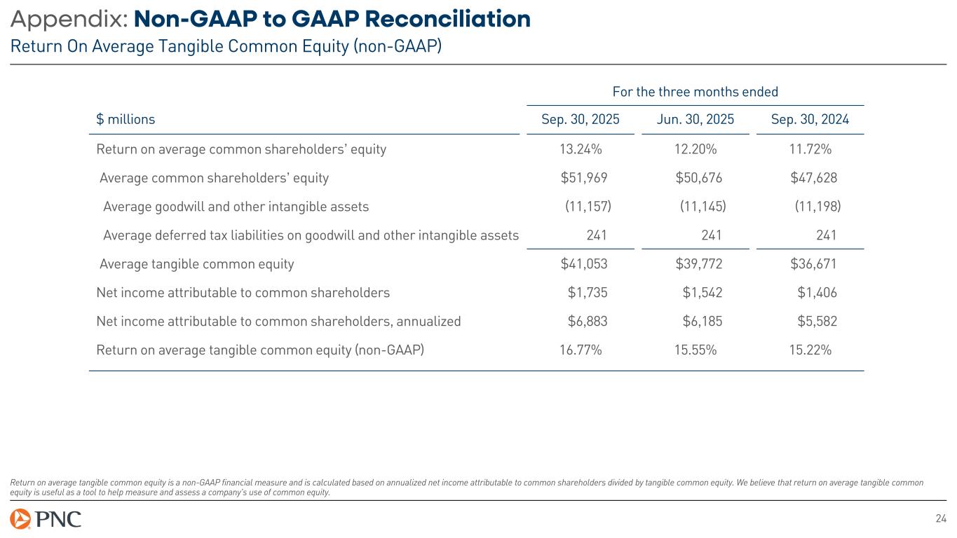 24 Appendix: Non-GAAP to GAAP Reconciliation Return On Average Tangible Common Equity (non-GAAP) Return on average tangible common equity is a non-GAAP financial measure and is calculated based on annualized net income attributable to common shareholders divided by tangible common equity. We believe that return on average tangible common  equity is useful as a tool to help measure and assess a company's use of common equity. For the three months ended $ millions Sep. 30, 2025 Jun. 30, 2025 Sep. 30, 2024 Return on average common shareholders’ equity 13.24% 12.20% 11.72% Average common shareholders’ equity $51,969 $50,676 $47,628 Average goodwill and other intangible assets (11,157) (11,145) (11,198) Average deferred tax liabilities on goodwill and other intangible assets 241 241 241 Average tangible common equity $41,053 $39,772 $36,671 Net income attributable to common shareholders $1,735 $1,542 $1,406 Net income attributable to common shareholders, annualized $6,883 $6,185 $5,582 Return on average tangible common equity (non-GAAP) 16.77% 15.55% 15.22%