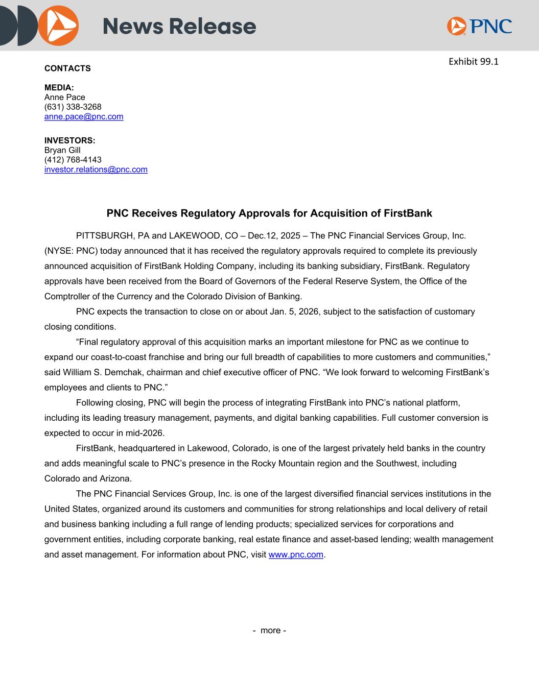 News Release CONTACTS MEDIA: Anne Pace (631) 338-3268 anne.pace@pnc.com INVESTORS: Bryan Gill (412) 768-4143 investor.relations@pnc.com PNC Receives Regulatory Approvals for Acquisition of FirstBank PITTSBURGH, PA and LAKEWOOD, CO – Dec.12, 2025 – The PNC Financial Services Group, Inc. (NYSE: PNC) today announced that it has received the regulatory approvals required to complete its previously announced acquisition of FirstBank Holding Company, including its banking subsidiary, FirstBank. Regulatory approvals have been received from the Board of Governors of the Federal Reserve System, the Office of the Comptroller of the Currency and the Colorado Division of Banking. PNC expects the transaction to close on or about Jan. 5, 2026, subject to the satisfaction of customary closing conditions. “Final regulatory approval of this acquisition marks an important milestone for PNC as we continue to expand our coast-to-coast franchise and bring our full breadth of capabilities to more customers and communities,” said William S. Demchak, chairman and chief executive officer of PNC. “We look forward to welcoming FirstBank’s employees and clients to PNC.” Following closing, PNC will begin the process of integrating FirstBank into PNC’s national platform, including its leading treasury management, payments, and digital banking capabilities. Full customer conversion is expected to occur in mid-2026. FirstBank, headquartered in Lakewood, Colorado, is one of the largest privately held banks in the country and adds meaningful scale to PNC’s presence in the Rocky Mountain region and the Southwest, including Colorado and Arizona. The PNC Financial Services Group, Inc. is one of the largest diversified financial services institutions in the United States, organized around its customers and communities for strong relationships and local delivery of retail and business banking including a full range of lending products; specialized services for corporations and government entities, including corporate banking, real estate finance and asset-based lending; wealth management and asset management. For information about PNC, visit www.pnc.com. - more -