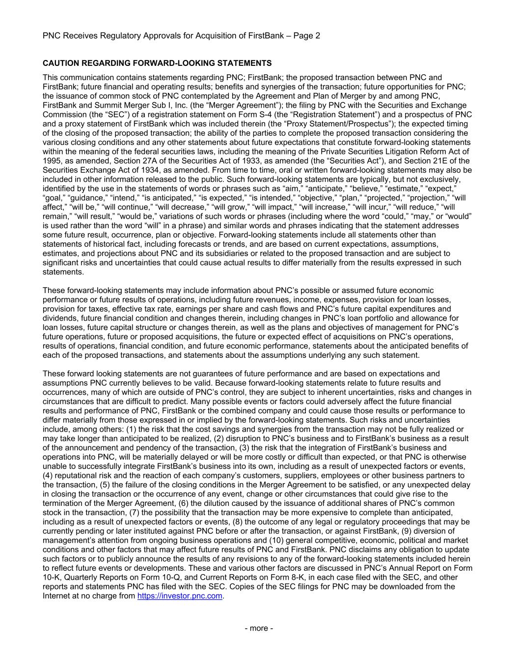 PNC Receives Regulatory Approvals for Acquisition of FirstBank – Page 2 CAUTION REGARDING FORWARD-LOOKING STATEMENTS This communication contains statements regarding PNC; FirstBank; the proposed transaction between PNC and FirstBank; future financial and operating results; benefits and synergies of the transaction; future opportunities for PNC; the issuance of common stock of PNC contemplated by the Agreement and Plan of Merger by and among PNC, FirstBank and Summit Merger Sub I, Inc. (the “Merger Agreement”); the filing by PNC with the Securities and Exchange Commission (the “SEC”) of a registration statement on Form S-4 (the “Registration Statement”) and a prospectus of PNC and a proxy statement of FirstBank which was included therein (the “Proxy Statement/Prospectus”); the expected timing of the closing of the proposed transaction; the ability of the parties to complete the proposed transaction considering the various closing conditions and any other statements about future expectations that constitute forward-looking statements within the meaning of the federal securities laws, including the meaning of the Private Securities Litigation Reform Act of 1995, as amended, Section 27A of the Securities Act of 1933, as amended (the “Securities Act”), and Section 21E of the Securities Exchange Act of 1934, as amended. From time to time, oral or written forward-looking statements may also be included in other information released to the public. Such forward-looking statements are typically, but not exclusively, identified by the use in the statements of words or phrases such as “aim,” “anticipate,” “believe,” “estimate,” “expect,” “goal,” “guidance,” “intend,” “is anticipated,” “is expected,” “is intended,” “objective,” “plan,” “projected,” “projection,” “will affect,” “will be,” “will continue,” “will decrease,” “will grow,” “will impact,” “will increase,” “will incur,” “will reduce,” “will remain,” “will result,” “would be,” variations of such words or phrases (including where the word “could,” “may,” or “would” is used rather than the word “will” in a phrase) and similar words and phrases indicating that the statement addresses some future result, occurrence, plan or objective. Forward-looking statements include all statements other than statements of historical fact, including forecasts or trends, and are based on current expectations, assumptions, estimates, and projections about PNC and its subsidiaries or related to the proposed transaction and are subject to significant risks and uncertainties that could cause actual results to differ materially from the results expressed in such statements. These forward-looking statements may include information about PNC’s possible or assumed future economic performance or future results of operations, including future revenues, income, expenses, provision for loan losses, provision for taxes, effective tax rate, earnings per share and cash flows and PNC’s future capital expenditures and dividends, future financial condition and changes therein, including changes in PNC’s loan portfolio and allowance for loan losses, future capital structure or changes therein, as well as the plans and objectives of management for PNC’s future operations, future or proposed acquisitions, the future or expected effect of acquisitions on PNC’s operations, results of operations, financial condition, and future economic performance, statements about the anticipated benefits of each of the proposed transactions, and statements about the assumptions underlying any such statement. These forward looking statements are not guarantees of future performance and are based on expectations and assumptions PNC currently believes to be valid. Because forward-looking statements relate to future results and occurrences, many of which are outside of PNC’s control, they are subject to inherent uncertainties, risks and changes in circumstances that are difficult to predict. Many possible events or factors could adversely affect the future financial results and performance of PNC, FirstBank or the combined company and could cause those results or performance to differ materially from those expressed in or implied by the forward-looking statements. Such risks and uncertainties include, among others: (1) the risk that the cost savings and synergies from the transaction may not be fully realized or may take longer than anticipated to be realized, (2) disruption to PNC’s business and to FirstBank’s business as a result of the announcement and pendency of the transaction, (3) the risk that the integration of FirstBank’s business and operations into PNC, will be materially delayed or will be more costly or difficult than expected, or that PNC is otherwise unable to successfully integrate FirstBank’s business into its own, including as a result of unexpected factors or events, (4) reputational risk and the reaction of each company’s customers, suppliers, employees or other business partners to the transaction, (5) the failure of the closing conditions in the Merger Agreement to be satisfied, or any unexpected delay in closing the transaction or the occurrence of any event, change or other circumstances that could give rise to the termination of the Merger Agreement, (6) the dilution caused by the issuance of additional shares of PNC’s common stock in the transaction, (7) the possibility that the transaction may be more expensive to complete than anticipated, including as a result of unexpected factors or events, (8) the outcome of any legal or regulatory proceedings that may be currently pending or later instituted against PNC before or after the transaction, or against FirstBank, (9) diversion of management’s attention from ongoing business operations and (10) general competitive, economic, political and market conditions a