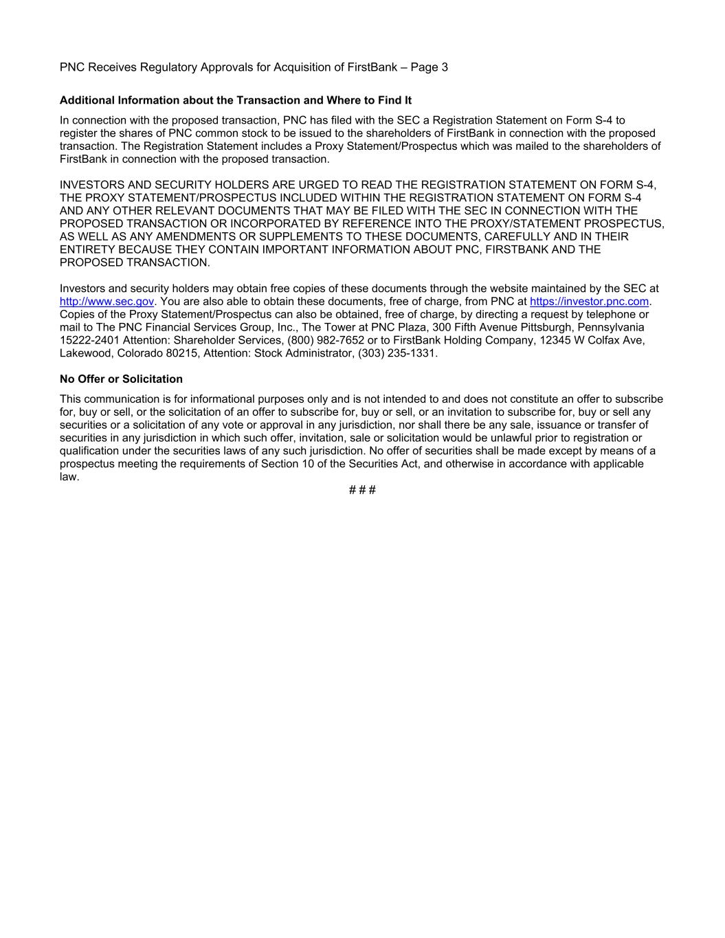 PNC Receives Regulatory Approvals for Acquisition of FirstBank – Page 3 Additional Information about the Transaction and Where to Find It In connection with the proposed transaction, PNC has filed with the SEC a Registration Statement on Form S-4 to register the shares of PNC common stock to be issued to the shareholders of FirstBank in connection with the proposed transaction. The Registration Statement includes a Proxy Statement/Prospectus which was mailed to the shareholders of FirstBank in connection with the proposed transaction. INVESTORS AND SECURITY HOLDERS ARE URGED TO READ THE REGISTRATION STATEMENT ON FORM S-4, THE PROXY STATEMENT/PROSPECTUS INCLUDED WITHIN THE REGISTRATION STATEMENT ON FORM S-4 AND ANY OTHER RELEVANT DOCUMENTS THAT MAY BE FILED WITH THE SEC IN CONNECTION WITH THE PROPOSED TRANSACTION OR INCORPORATED BY REFERENCE INTO THE PROXY/STATEMENT PROSPECTUS, AS WELL AS ANY AMENDMENTS OR SUPPLEMENTS TO THESE DOCUMENTS, CAREFULLY AND IN THEIR ENTIRETY BECAUSE THEY CONTAIN IMPORTANT INFORMATION ABOUT PNC, FIRSTBANK AND THE PROPOSED TRANSACTION. Investors and security holders may obtain free copies of these documents through the website maintained by the SEC at http://www.sec.gov. You are also able to obtain these documents, free of charge, from PNC at https://investor.pnc.com. Copies of the Proxy Statement/Prospectus can also be obtained, free of charge, by directing a request by telephone or mail to The PNC Financial Services Group, Inc., The Tower at PNC Plaza, 300 Fifth Avenue Pittsburgh, Pennsylvania 15222-2401 Attention: Shareholder Services, (800) 982-7652 or to FirstBank Holding Company, 12345 W Colfax Ave, Lakewood, Colorado 80215, Attention: Stock Administrator, (303) 235-1331. No Offer or Solicitation This communication is for informational purposes only and is not intended to and does not constitute an offer to subscribe for, buy or sell, or the solicitation of an offer to subscribe for, buy or sell, or an invitation to subscribe for, buy or sell any securities or a solicitation of any vote or approval in any jurisdiction, nor shall there be any sale, issuance or transfer of securities in any jurisdiction in which such offer, invitation, sale or solicitation would be unlawful prior to registration or qualification under the securities laws of any such jurisdiction. No offer of securities shall be made except by means of a prospectus meeting the requirements of Section 10 of the Securities Act, and otherwise in accordance with applicable law. # # #