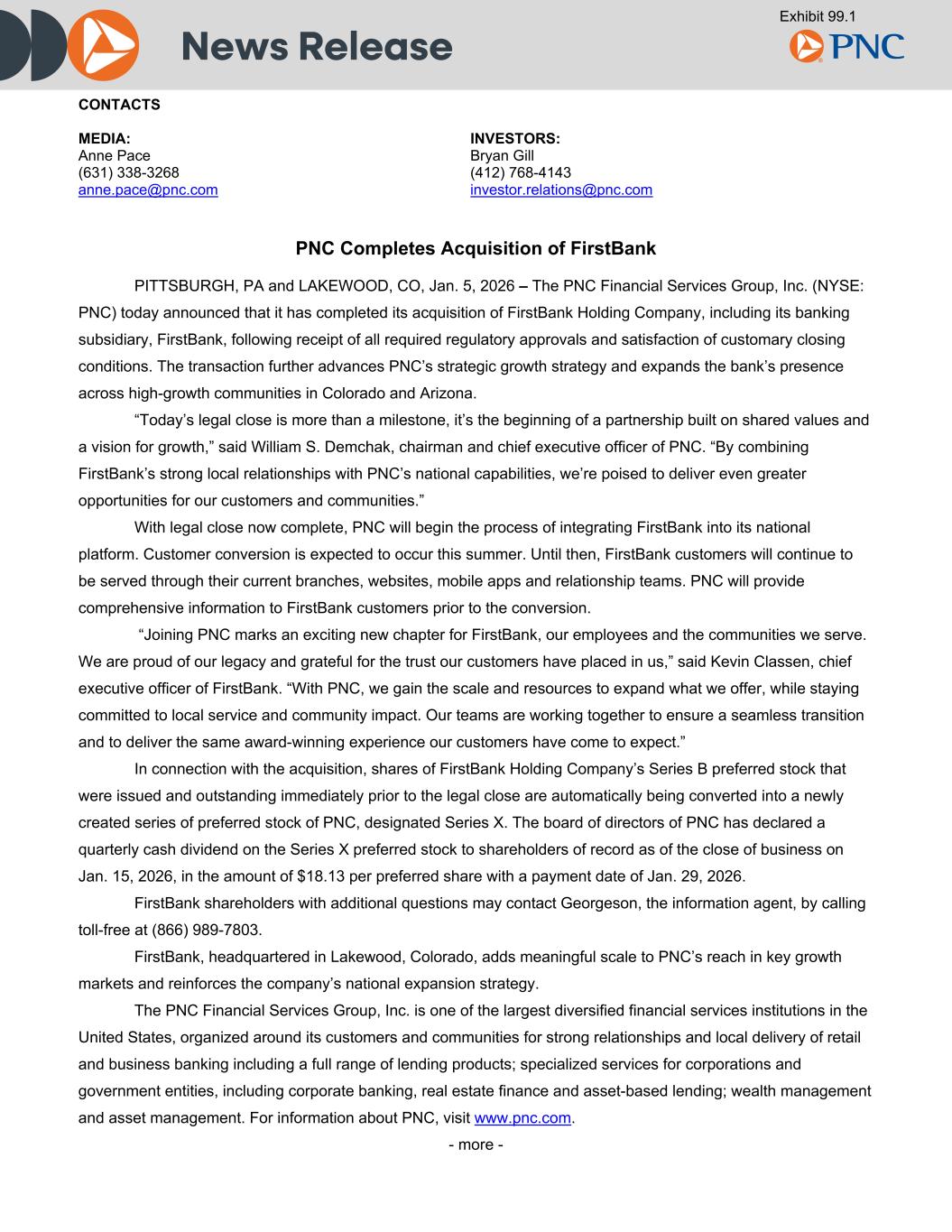 News Release CONTACTS MEDIA: INVESTORS: Anne Pace Bryan Gill (631) 338-3268 (412) 768-4143 anne.pace@pnc.com investor.relations@pnc.com PNC Completes Acquisition of FirstBank PITTSBURGH, PA and LAKEWOOD, CO, Jan. 5, 2026 – The PNC Financial Services Group, Inc. (NYSE: PNC) today announced that it has completed its acquisition of FirstBank Holding Company, including its banking subsidiary, FirstBank, following receipt of all required regulatory approvals and satisfaction of customary closing conditions. The transaction further advances PNC’s strategic growth strategy and expands the bank’s presence across high-growth communities in Colorado and Arizona. “Today’s legal close is more than a milestone, it’s the beginning of a partnership built on shared values and a vision for growth,” said William S. Demchak, chairman and chief executive officer of PNC. “By combining FirstBank’s strong local relationships with PNC’s national capabilities, we’re poised to deliver even greater opportunities for our customers and communities.” With legal close now complete, PNC will begin the process of integrating FirstBank into its national platform. Customer conversion is expected to occur this summer. Until then, FirstBank customers will continue to be served through their current branches, websites, mobile apps and relationship teams. PNC will provide comprehensive information to FirstBank customers prior to the conversion. “Joining PNC marks an exciting new chapter for FirstBank, our employees and the communities we serve. We are proud of our legacy and grateful for the trust our customers have placed in us,” said Kevin Classen, chief executive officer of FirstBank. “With PNC, we gain the scale and resources to expand what we offer, while staying committed to local service and community impact. Our teams are working together to ensure a seamless transition and to deliver the same award-winning experience our customers have come to expect.” In connection with the acquisition, shares of FirstBank Holding Company’s Series B preferred stock that were issued and outstanding immediately prior to the legal close are automatically being converted into a newly created series of preferred stock of PNC, designated Series X. The board of directors of PNC has declared a quarterly cash dividend on the Series X preferred stock to shareholders of record as of the close of business on Jan. 15, 2026, in the amount of $18.13 per preferred share with a payment date of Jan. 29, 2026. FirstBank shareholders with additional questions may contact Georgeson, the information agent, by calling toll-free at (866) 989-7803. FirstBank, headquartered in Lakewood, Colorado, adds meaningful scale to PNC’s reach in key growth markets and reinforces the company’s national expansion strategy. The PNC Financial Services Group, Inc. is one of the largest diversified financial services institutions in the United States, organized around its customers and communities for strong relationships and local delivery of retail and business banking including a full range of lending products; specialized services for corporations and government entities, including corporate banking, real estate finance and asset-based lending; wealth management and asset management. For information about PNC, visit www.pnc.com. - more -