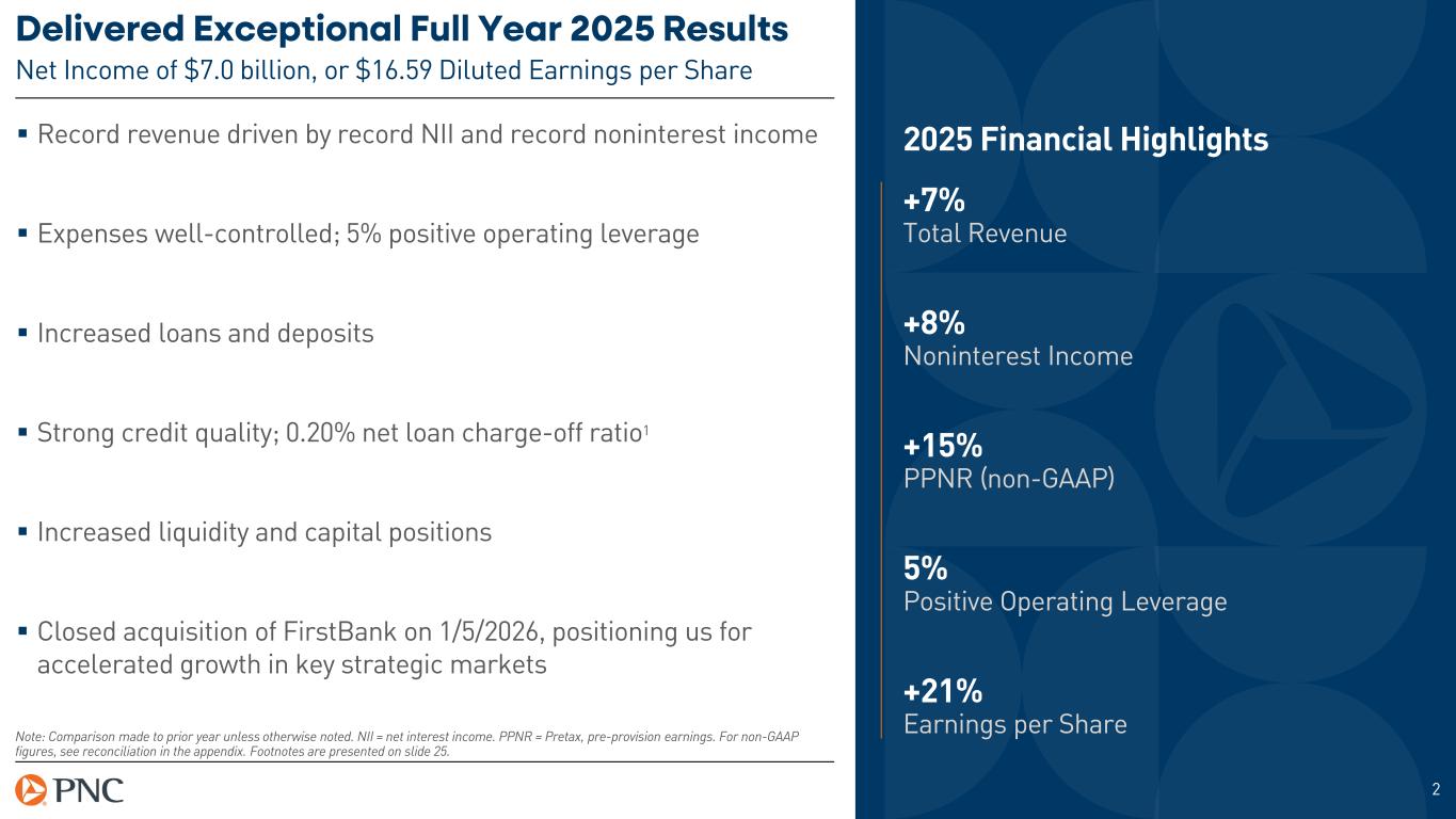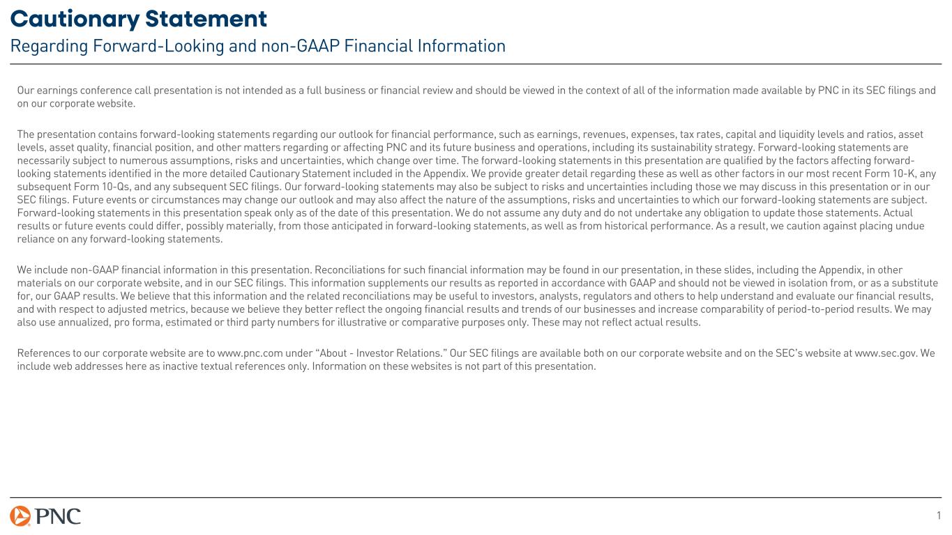 1 Cautionary Statement Regarding Forward-Looking and non-GAAP Financial Information Our earnings conference call presentation is not intended as a full business or financial review and should be viewed in the context of all of the information made available by PNC in its SEC filings and on our corporate website. The presentation contains forward-looking statements regarding our outlook for financial performance, such as earnings, revenues, expenses, tax rates, capital and liquidity levels and ratios, asset levels, asset quality, financial position, and other matters regarding or affecting PNC and its future business and operations, including its sustainability strategy. Forward-looking statements are necessarily subject to numerous assumptions, risks and uncertainties, which change over time. The forward-looking statements in this presentation are qualified by the factors affecting forward- looking statements identified in the more detailed Cautionary Statement included in the Appendix. We provide greater detail regarding these as well as other factors in our most recent Form 10-K, any subsequent Form 10-Qs, and any subsequent SEC filings. Our forward-looking statements may also be subject to risks and uncertainties including those we may discuss in this presentation or in our SEC filings. Future events or circumstances may change our outlook and may also affect the nature of the assumptions, risks and uncertainties to which our forward-looking statements are subject. Forward-looking statements in this presentation speak only as of the date of this presentation. We do not assume any duty and do not undertake any obligation to update those statements. Actual results or future events could differ, possibly materially, from those anticipated in forward-looking statements, as well as from historical performance. As a result, we caution against placing undue reliance on any forward-looking statements. We include non-GAAP financial information in this presentation. Reconciliations for such financial information may be found in our presentation, in these slides, including the Appendix, in other materials on our corporate website, and in our SEC filings. This information supplements our results as reported in accordance with GAAP and should not be viewed in isolation from, or as a substitute for, our GAAP results. We believe that this information and the related reconciliations may be useful to investors, analysts, regulators and others to help understand and evaluate our financial results, and with respect to adjusted metrics, because we believe they better reflect the ongoing financial results and trends of our businesses and increase comparability of period-to-period results. We may also use annualized, pro forma, estimated or third party numbers for illustrative or comparative purposes only. These may not reflect actual results. References to our corporate website are to www.pnc.com under “About - Investor Relations.” Our SEC filings are available both on our corporate website and on the SEC’s website at www.sec.gov. We include web addresses here as inactive textual references only. Information on these websites is not part of this presentation.