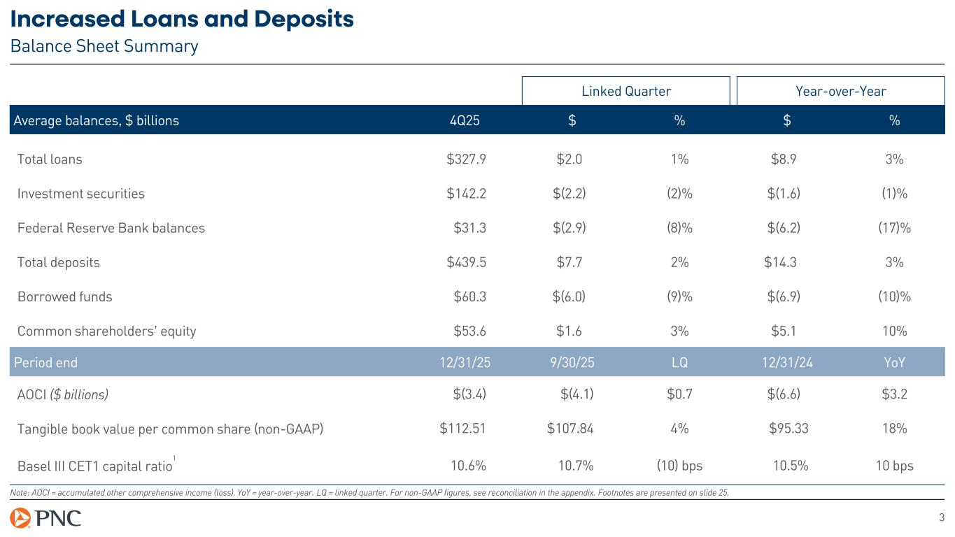 2 Delivered Exceptional Full Year 2025 Results Net Income of $7.0 billion, or $16.59 Diluted Earnings per Share Record revenue driven by record NII and record noninterest income Expenses well-controlled; 5% positive operating leverage Increased loans and deposits Strong credit quality; 0.20% net loan charge-off ratio1 Increased liquidity and capital positions Closed acquisition of FirstBank on 1/5/2026, positioning us for accelerated growth in key strategic markets Note: Comparison made to prior year unless otherwise noted. NII = net interest income. PPNR = Pretax, pre-provision earnings. For non-GAAP figures, see reconciliation in the appendix. Footnotes are presented on slide 25. +7% Total Revenue +8% Noninterest Income +15% PPNR (non-GAAP) +21% Earnings per Share 2025 Financial Highlights 5% Positive Operating Leverage