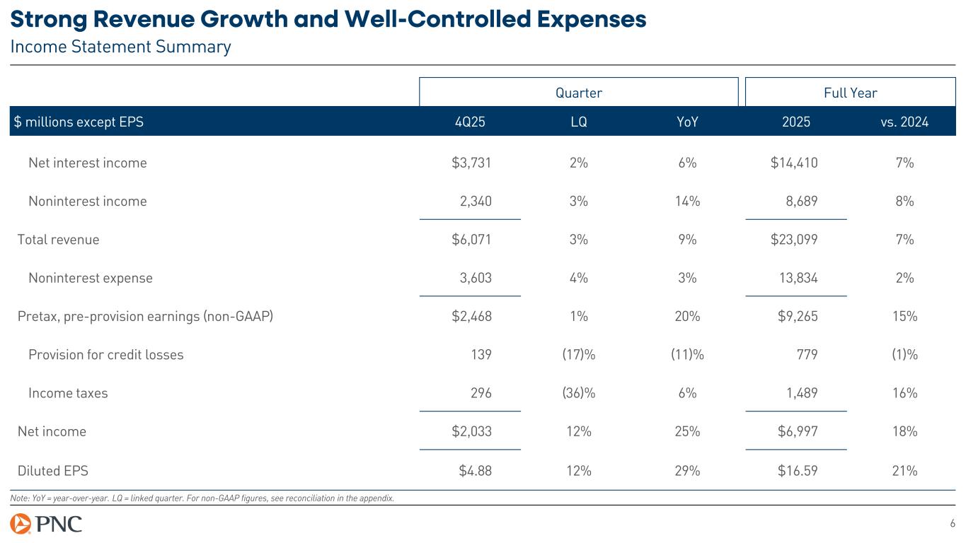 5 Deposits Increased Driven by Higher Commercial Deposits Note: YoY = year-over-year. LQ = linked quarter. IB = interest-bearing deposits. Consolidated Average Deposit Balances $425 $432 $440 2.43% 2.32% 2.14% 4Q24 3Q25 4Q25 Total Deposits Rate Paid on IB Deposits $ bi lli on s Average Commercial Deposits Average Consumer Deposits $ bi lli on s $ bi lli on s $136 $144 $150 4Q24 3Q25 4Q25 $76 $72 $74 4Q24 3Q25 4Q25 Interest-Bearing Noninterest-Bearing $185 $188 $189 4Q24 3Q25 4Q25 $21 $21 $21 4Q24 3Q25 4Q25 Interest-Bearing Noninterest-Bearing Rate Paid (18) bps LQ and (29) bps YoY Total Deposits +2% LQ and +3% YoY