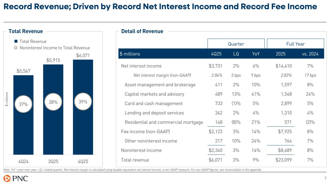 6 Strong Revenue Growth and Well-Controlled Expenses Income Statement Summary Quarter Full Year $ millions except EPS 4Q25 LQ YoY 2025 vs. 2024 Net interest income $3,731 2% 6% $14,410 7% Noninterest income 2,340 3% 14% 8,689 8% Total revenue $6,071 3% 9% $23,099 7% Noninterest expense 3,603 4% 3% 13,834 2% Pretax, pre-provision earnings (non-GAAP) $2,468 1% 20% $9,265 15% Provision for credit losses 139 (17)% (11)% 779 (1)% Income taxes 296 (36)% 6% 1,489 16% Net income $2,033 12% 25% $6,997 18% Diluted EPS $4.88 12% 29% $16.59 21% Note: YoY = year-over-year. LQ = linked quarter. For non-GAAP figures, see reconciliation in the appendix.