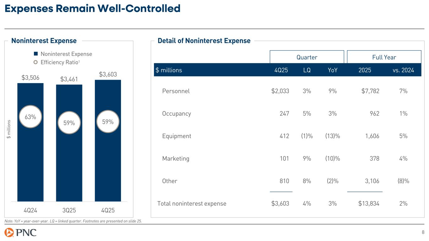 7 Record Revenue; Driven by Record Net Interest Income and Record Fee Income Note: YoY = year-over-year. LQ = linked quarter. Net interest margin is calculated using taxable-equivalent net interest income, a non-GAAP measure. For non-GAAP figures, see reconciliation in the appendix. Total Revenue $5,567 $5,915 $6,071 37% 38% 39% 4Q24 3Q25 4Q25 Quarter Full Year $ millions 4Q25 LQ YoY 2025 vs. 2024 Net interest income $3,731 2% 6% $14,410 7% Net interest margin (non-GAAP) 2.84% 5 bps 9 bps 2.83% 17 bps Asset management and brokerage 411 2% 10% 1,597 8% Capital markets and advisory 489 13% 41% 1,548 24% Card and cash management 733 (1)% 5% 2,899 5% Lending and deposit services 342 2% 4% 1,310 4% Residential and commercial mortgage 148 (8)% 21% 571 (2)% Fee income (non-GAAP) $2,123 3% 14% $7,925 8% Other noninterest income 217 10% 24% 764 7% Noninterest income $2,340 3% 14% $8,689 8% Total revenue $6,071 3% 9% $23,099 7% Detail of Revenue Total Revenue Noninterest Income to Total Revenue $ m ill io ns