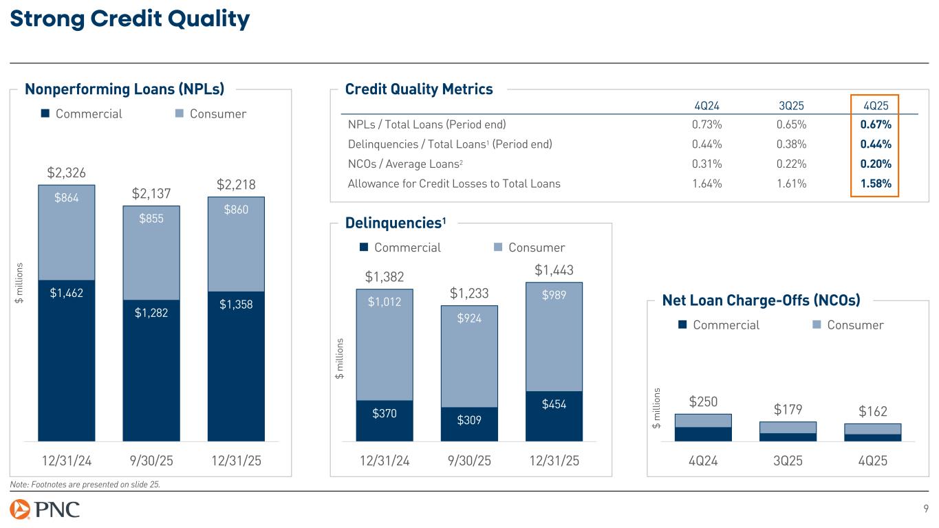 8 Expenses Remain Well-Controlled Note: YoY = year-over-year. LQ = linked quarter. Footnotes are presented on slide 25. Noninterest Expense Quarter Full Year $ millions 4Q25 LQ YoY 2025 vs. 2024 Personnel $2,033 3% 9% $7,782 7% Occupancy 247 5% 3% 962 1% Equipment 412 (1)% (13)% 1,606 5% Marketing 101 9% (10)% 378 4% Other 810 8% (2)% 3,106 (8)% Total noninterest expense $3,603 4% 3% $13,834 2% Detail of Noninterest Expense $ m ill io ns Noninterest Expense Efficiency Ratio1 $3,506 $3,461 $3,603 63% 59% 59% 4Q24 3Q25 4Q25