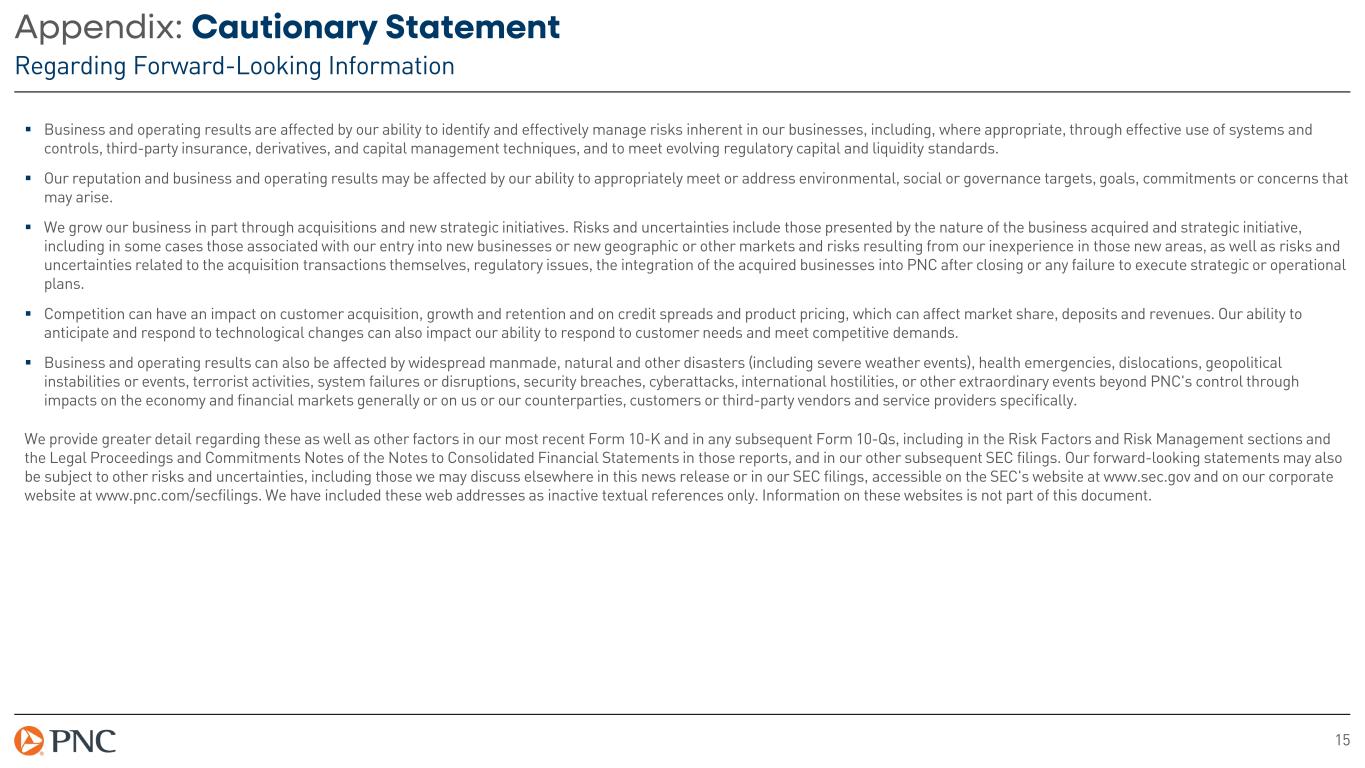 14 Appendix: Cautionary Statement Regarding Forward-Looking Information Our forward-looking financial statements are subject to the risk that economic and financial market conditions will be substantially different than those we are currently expecting. These statements are based on our views that: − PNC’s baseline forecast remains for continued expansion, but slower economic growth in 2026 than in 2024 and 2025. Tariffs remain a drag on consumer spending and business investment, while AI-related capex and wealth effects have been key supports to growth. Consumer spending growth is slowing to a pace more consistent with household income growth. The One Big Beautiful Bill will be a net positive for economic growth in 2026. − The baseline forecast anticipates real GDP growth slowing to around 2% in 2026, with continued modest job gains and the unemployment rate at around 4.5%. Tariffs remain a risk to the outlook, and a reversal in sentiment around AI or a large decline in equity prices would be drags. Weaker labor force growth could lead to weaker long-run growth. − Our baseline forecast is for the Federal Reserve to go on hold at the upcoming January meeting and stay on hold for the first half of this year. We expect modest additional easing in the second half of the year and expect 25 basis points cuts at the Federal Open Market Committee meetings in July and September 2026, resulting in a federal funds rate in the range of 3.00% to 3.25% by the fall. However, there are two-sided risks to this outlook: (1) if inflation re-accelerates or proves more persistent than expected, the Federal Reserve may cut less or (2) if growth falters or recession emerges, easing could be deeper and more prolonged. PNC's ability to take certain capital actions, including returning capital to shareholders, is subject to PNC meeting or exceeding minimum capital levels, including a stress capital buffer established by the Federal Reserve Board in connection with the Federal Reserve Board's Comprehensive Capital Analysis and Review (CCAR) process. PNC's regulatory capital ratios in the future will depend on, among other things, PNC's financial performance, the scope and terms of final capital regulations then in effect and management actions affecting the composition of PNC's balance sheet. In addition, PNC's ability to determine, evaluate and forecast regulatory capital ratios, and to take actions (such as capital distributions) based on actual or forecasted capital ratios, will be dependent at least in part on the development, validation and regulatory review of related models and the reliability of and risks resulting from extensive use of such models. Legal and regulatory developments could have an impact on our ability to operate our businesses, financial condition, results of operations, competitive position, reputation, or pursuit of attractive acquisition opportunities. Reputational impacts could affect matters such as business generation and retention, liquidity, funding, and ability to attract and retain employees. These developments could include: − Changes to laws and regulations, including changes affecting oversight of the financial services industry, changes in the enforcement and interpretation of such laws and regulations, and changes in accounting and reporting standards. − Unfavorable resolution of legal proceedings or other claims and regulatory and other governmental investigations or other inquiries resulting in monetary losses, costs, or alterations in our business practices, and potentially causing reputational harm to PNC. − Results of the regulatory examination and supervision process, including our failure to satisfy requirements of agreements with governmental agencies. − Costs associated with obtaining rights in intellectual property claimed by others and of adequacy of our intellectual property protection in general.