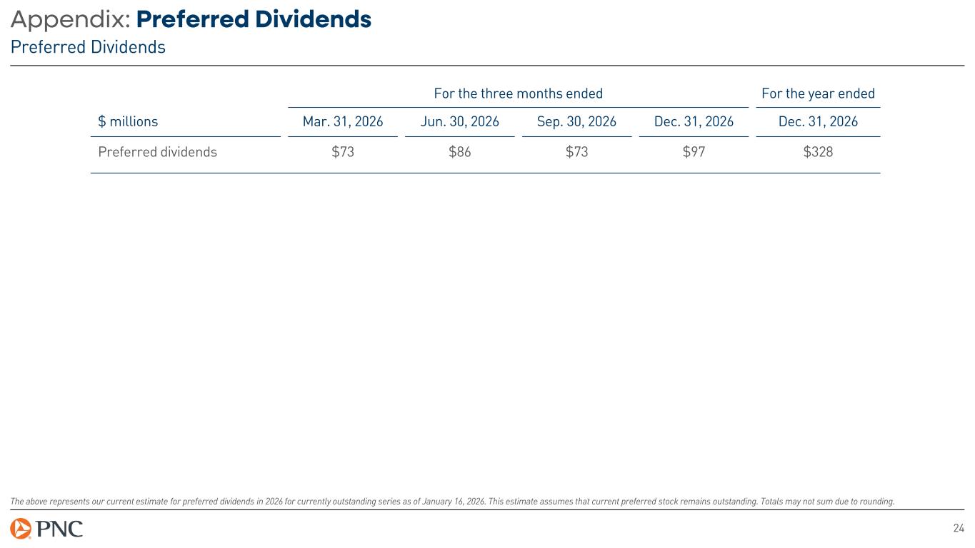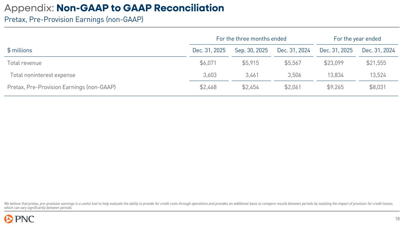 17 Appendix: Non-GAAP to GAAP Reconciliation Consolidated CET1 Ratio, including AOCI & Other Fully Phased-In Expanded Risk-Based Approach (ERBA) Impacts, Basel III Endgame Impacts (non-GAAP) As permitted, PNC has elected to exclude AOCI related to both available for sale securities and pension and other post-retirement plans from CET1 capital. CET1 ratio, including AOCI, is a non-GAAP measure and is calculated based on common equity Tier 1 capital, inclusive of AOCI adjustments, divided by risk-weighted assets, inclusive of AOCI adjustments. AOCI adjustments include ASC 320 Investments – Debt Securities and ASC 815 Derivatives and Hedging, ASC 715 Compensation – Retirement Benefits, as well as changes related to deferred taxes. We believe this non-GAAP measure shows, among other things, the impact of adding back net unrealized gains and subtracting net unrealized losses on AFS / HTM securities and the subsequent impact to our CET1 ratio. CET1 ratio, Basel III Endgame, is a non-GAAP measure and is calculated based on common equity Tier 1 capital, inclusive of AOCI and additional Basel III Endgame adjustments, divided by risk-weighted assets, inclusive of AOCI and additional Basel III Endgame adjustments. Additional Basel III Endgame adjustments include MSR threshold deductions, as well as adjustments related to credit risk, operational risk, credit valuation adjustments, and market risk. We believe this non-GAAP measure shows, among other things, the full impact of the Basel III Endgame NPR and the subsequent impact to our CET1 ratio. Totals may not sum due to rounding. December 31, 2025 (estimated): $ billions Common Equity Tier 1 Capital December 31, 2025 (estimated): $ billions Risk-Weighted Assets (RWA) Common stock, related surplus and retained earnings, net of treasury stock $58.2 RWA, standardized approach $444.6 Goodwill and disallowed intangibles, net of deferred tax liabilities (10.9) Estimated impacts to RWA from AOCI adjustments 2.5 All other adjustments (0.1) RWA, including AOCI $447.0 Common equity tier 1 capital (as reported) $47.3 Additional net impacts to RWA from Basel III endgame 9.3 Estimated AOCI adjustments, Basel III endgame (3.3) RWA, fully phased-in ERBA, Basel III endgame $456.3 Common equity tier 1 capital, including AOCI $44.0 Estimated additional impact from threshold deductions, Basel III endgame – Common equity tier 1 capital, Basel III endgame $44.0 Common equity tier 1 ratio 10.6% Common equity tier 1 ratio, including AOCI (non-GAAP) 9.8% Common equity tier 1 ratio, fully phased-in ERBA, Basel III endgame (non-GAAP) 9.6%