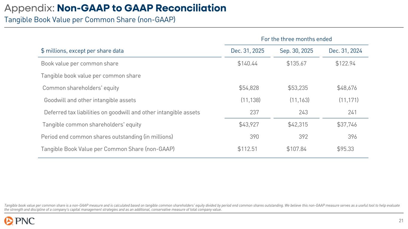 20 Appendix: Non-GAAP to GAAP Reconciliation Taxable-Equivalent Net Interest Income (non-GAAP) The interest income earned on certain earning assets is completely or partially exempt from federal income tax. As such, these tax-exempt instruments typically yield lower returns than taxable investments. To provide more meaningful comparisons of net interest income, we use interest income on a taxable-equivalent basis by increasing the interest income earned on tax-exempt assets to make it fully equivalent to interest income earned on taxable investments. This adjustment is not permitted under GAAP. Taxable-equivalent net interest income is only used for calculating net interest margin. Net interest income shown elsewhere in this presentation is GAAP net interest income. For the three months ended For the year ended $ millions Dec. 31, 2025 Sep. 30, 2025 Dec. 31, 2024 Dec. 31, 2025 Dec. 31, 2024 Net interest income $3,731 $3,648 $3,523 $14,410 $13,499 Taxable-equivalent adjustments 31 30 30 117 131 Taxable-Equivalent Net Interest Income (non-GAAP) $3,762 $3,678 $3,553 $14,527 $13,630