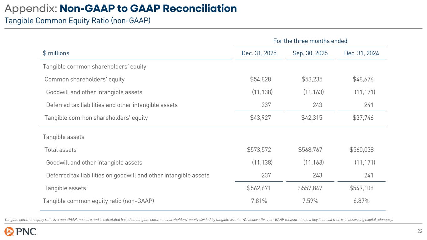 21 Appendix: Non-GAAP to GAAP Reconciliation Tangible Book Value per Common Share (non-GAAP) Tangible book value per common share is a non-GAAP measure and is calculated based on tangible common shareholders’ equity divided by period end common shares outstanding. We believe this non-GAAP measure serves as a useful tool to help evaluate the strength and discipline of a company's capital management strategies and as an additional, conservative measure of total company value. For the three months ended $ millions, except per share data Dec. 31, 2025 Sep. 30, 2025 Dec. 31, 2024 Book value per common share $140.44 $135.67 $122.94 Tangible book value per common share Common shareholders’ equity $54,828 $53,235 $48,676 Goodwill and other intangible assets (11,138) (11,163) (11,171) Deferred tax liabilities on goodwill and other intangible assets 237 243 241 Tangible common shareholders’ equity $43,927 $42,315 $37,746 Period end common shares outstanding (in millions) 390 392 396 Tangible Book Value per Common Share (non-GAAP) $112.51 $107.84 $95.33