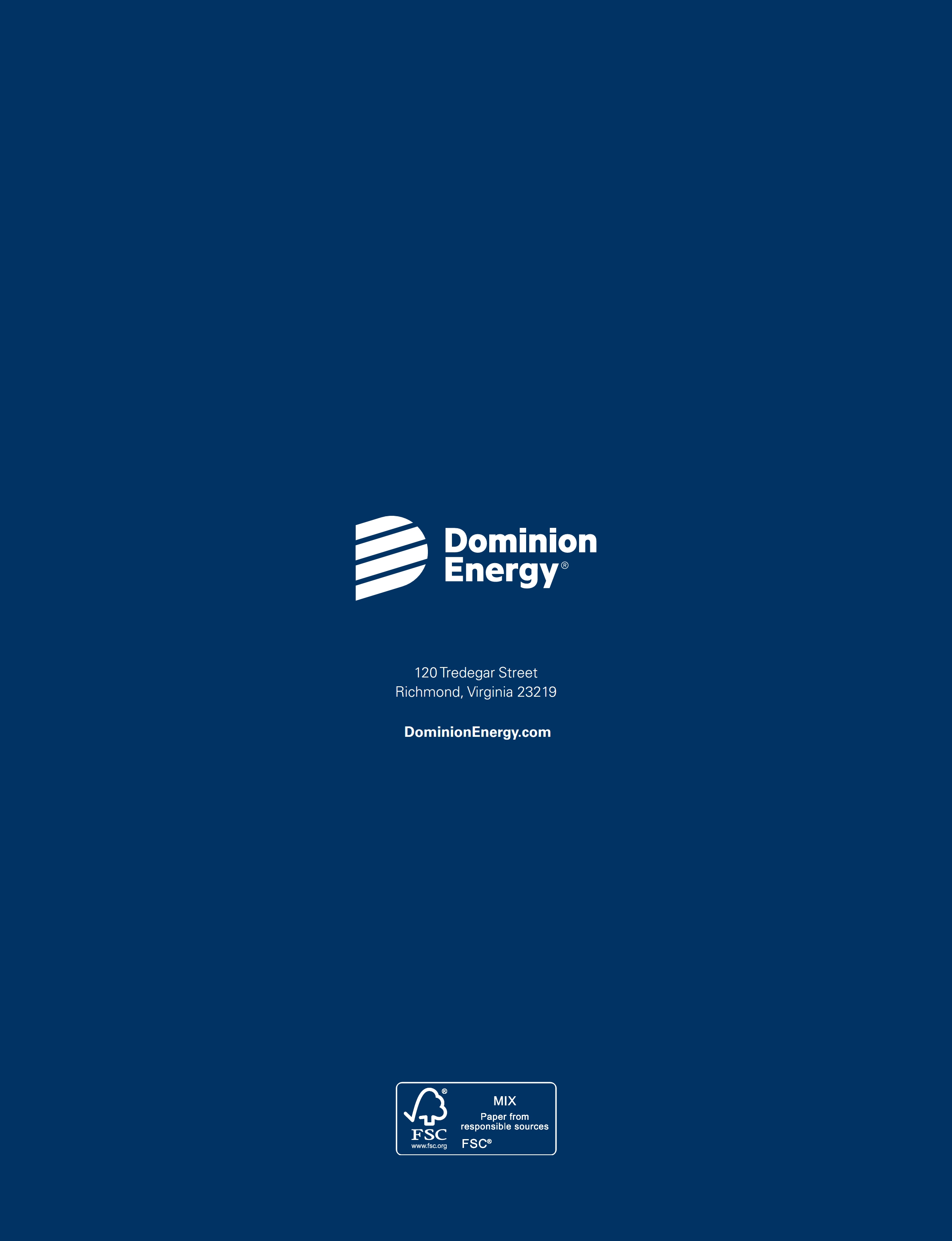 FORWARD-LOOKING STATEMENTS Certain statements contained in this Proxy Statement constitute “forward-looking” statements within the meaning of the Private Securities Litigation Reform Act. All statements other than statements of historical or current facts, including statements regarding future earnings, our business review, our environmental and other sustainability plans and goals, goals regarding our diverse hiring, statements regarding ongoing and future projects and the expected availability and benefits of such projects, are forward-looking statements. The words “believe,” “may,” “will,” “estimate,” “continue,” “anticipate,” “intend,” “expect,” and similar expressions are intended to identify forward-looking statements. Our statements about the future are subject to various risks and uncertainties. For factors that could cause actual results to differ from expected results, see the risk and uncertainties described throughout our Annual Report on Form 10-K for the year ended December 31, 2022 (2022 Annual Report on Form 10-K) and particularly in Item 1A. Risk Factors and Forward-Looking Statements in Item 7. Management’s Discussion and Analysis of Financial Condition and Results of Operations. These forward-looking statements speak only as of the date of this Proxy Statement. Dominion Energy, Inc. assumes no obligation to provide any revisions to, or update, any projections and forward-looking statements contained herein. |