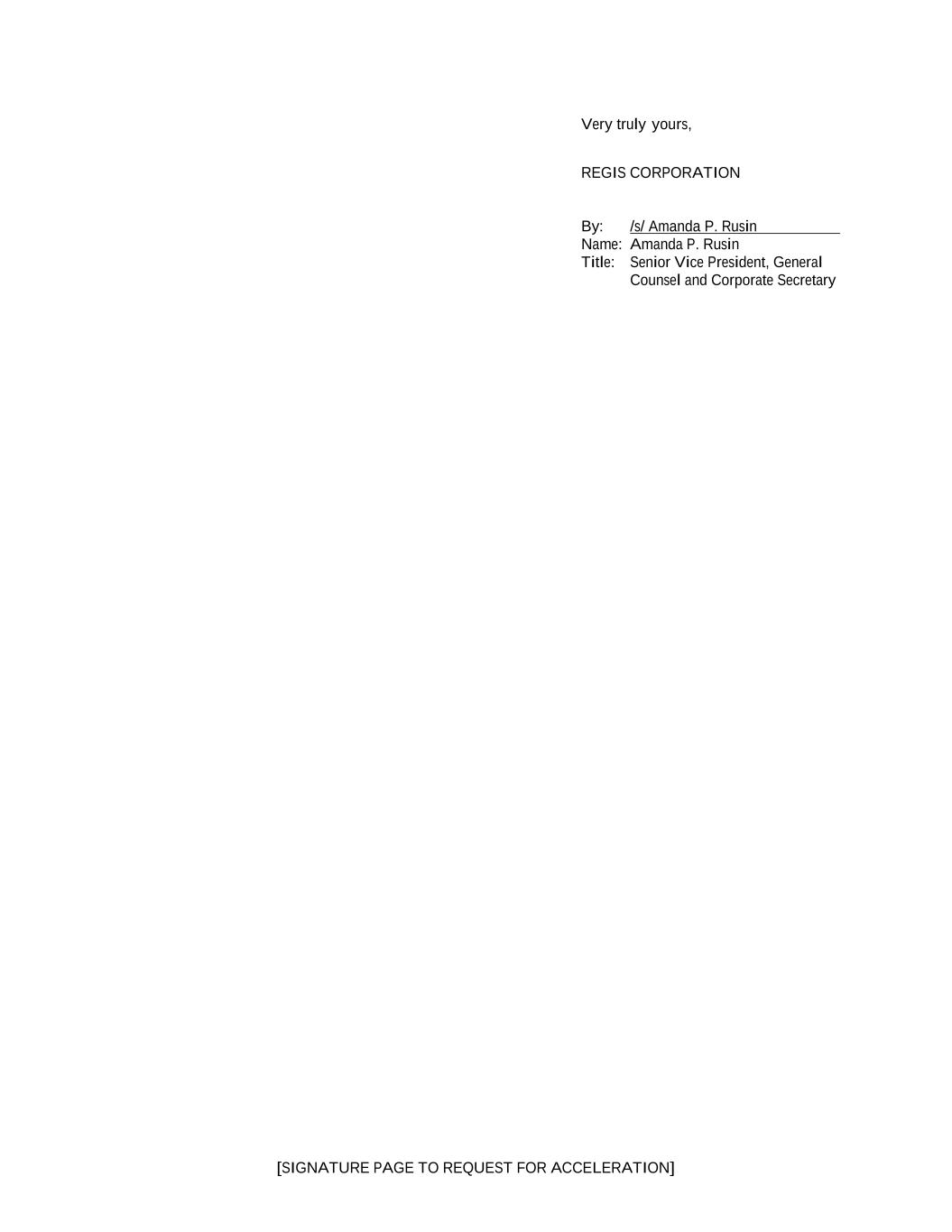 [SIGNATURE PAGE TO REQUEST FOR ACCELERATION] Very truly yours, REGIS CORPORATION By: /s/ Amanda P. Rusin Name: Amanda P. Rusin Title: Senior Vice President, General Counsel and Corporate Secretary